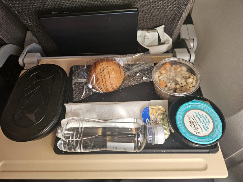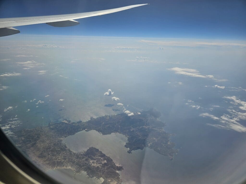 Fortunately, throughout the flight, the crew did not request passengers to shut their window blinds and seeing as most of those around me remained awake, I did not feel under pressure to shut them. Around twenty minutes after leaving Italy behind, the Greek island of Zakynthos appeared where plenty of tall stormy-looking clouds could be seen lingering. Passing this in no time, the aircraft made landfall over the Peloponnese however, thanks to clouds below, nothing of this could be seen as we cut right across the region. However, as we made our way out over the Aegean Sea, the clouds parted and revealed the occasional cluster of small islands, which included the likes of Milos and Santorini. As we passed these, around an hour and a half into the flight, the crew took the aisles once more and the lunch service commenced.