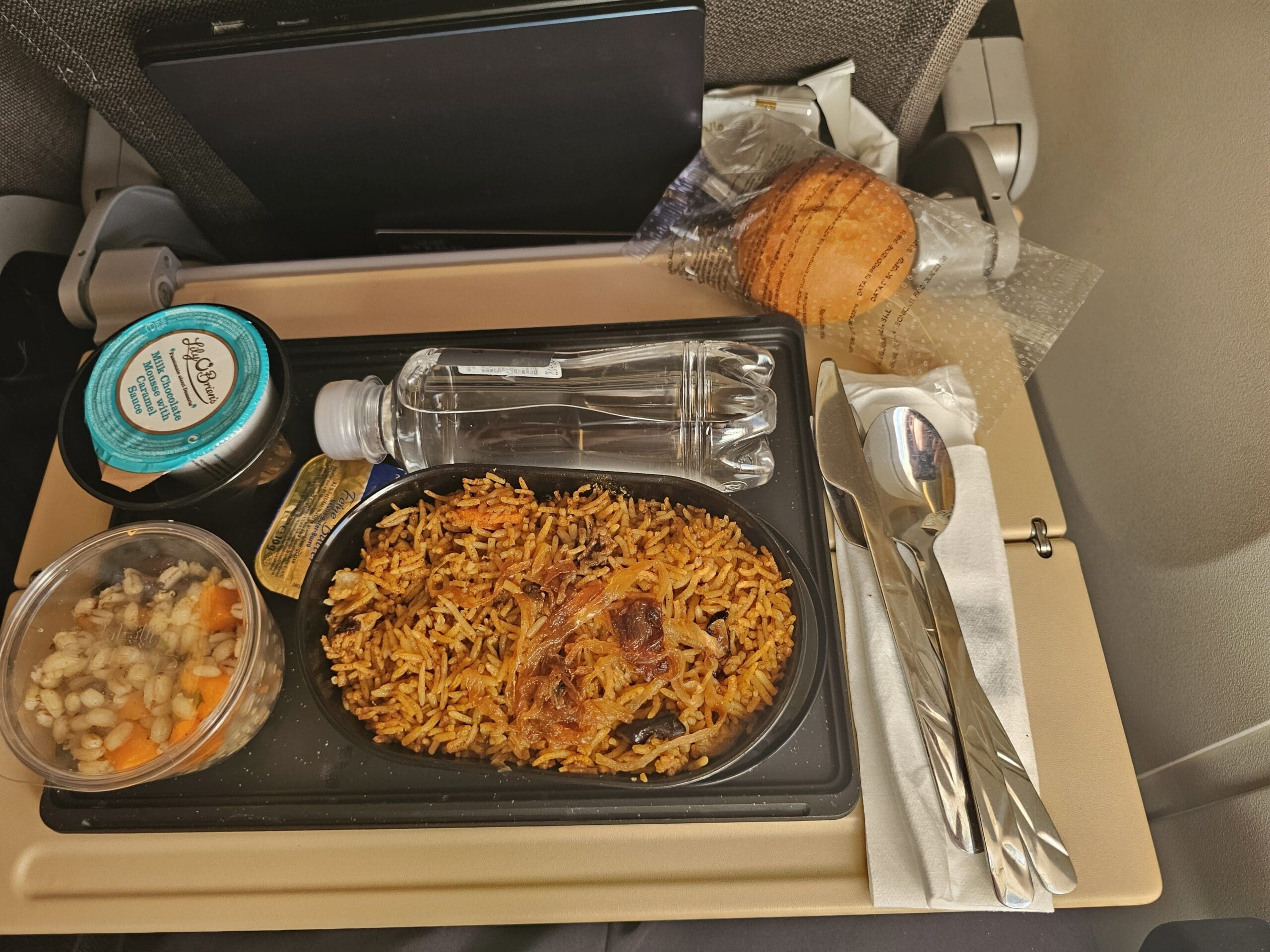 Taking their time to work through the cabin, around thirty minutes after this commenced one of the flight attendants reached my row at which point the aircraft was roughly halfway between Rhodes and Cyprus. That afternoon, two options were offered – ‘chicken’ or ‘vegetarian pasta’. Whilst I’m sure that the flight attendant would have explained these options in more detail had I asked, these basic descriptions left plenty to the imagination and, curious as to just what sort of dish it would be, I decided to go for the chicken. A few moments later, I was handed a tray which contained the main dish, a grain salad, a typically hard bread roll accompanied with a packet of butter, a small bottle of still water and a chocolate and salted caramel mousse to top this off. Adding some class, the eating utensils came in the form of proper metal cutlery featuring Etihad Airways’ logo. Opening the main dish, this turned out to be kabsa, a popular Middle Eastern chicken dish consisting of chicken with rice. Soon tasting this, I found this to be delicious and of decent quality, neither being too dry nor greasy. Meanwhile, the side salad was also of good quality, as was the dessert. All in all, I was thus left with absolutely nothing to complain about with this proving to be delicious and of good size and quality for the relatively short flight.