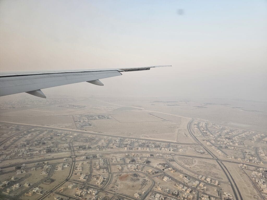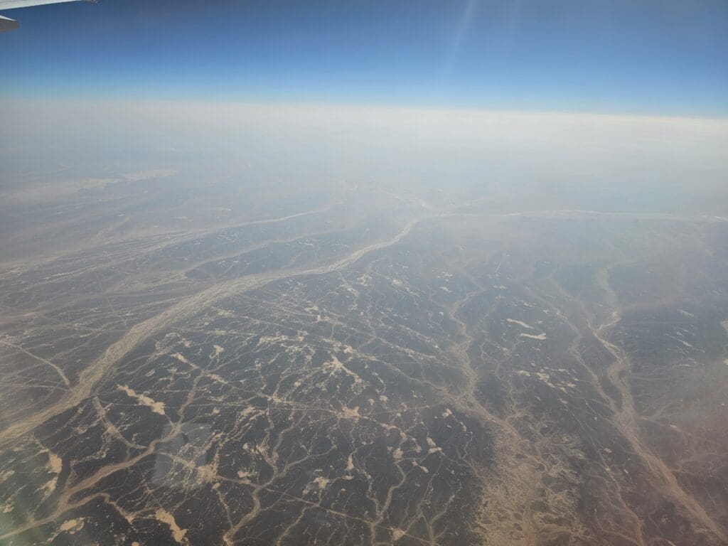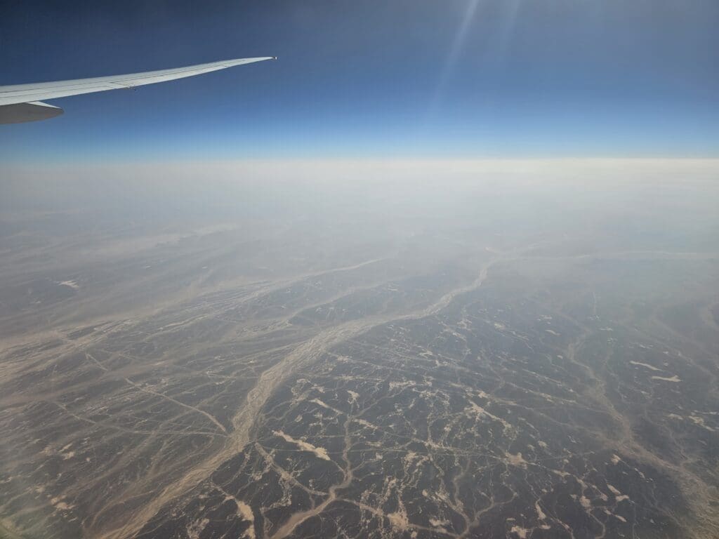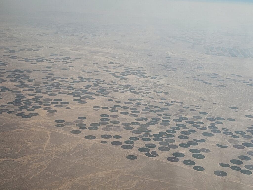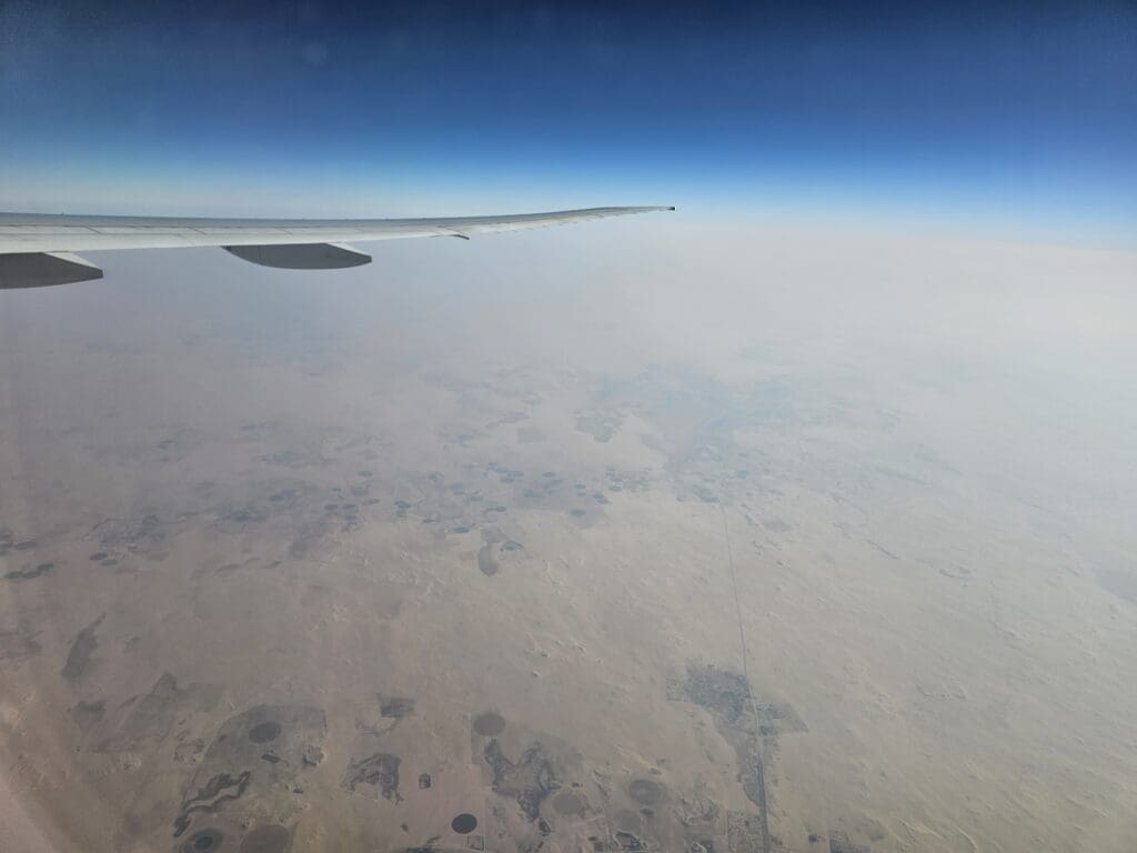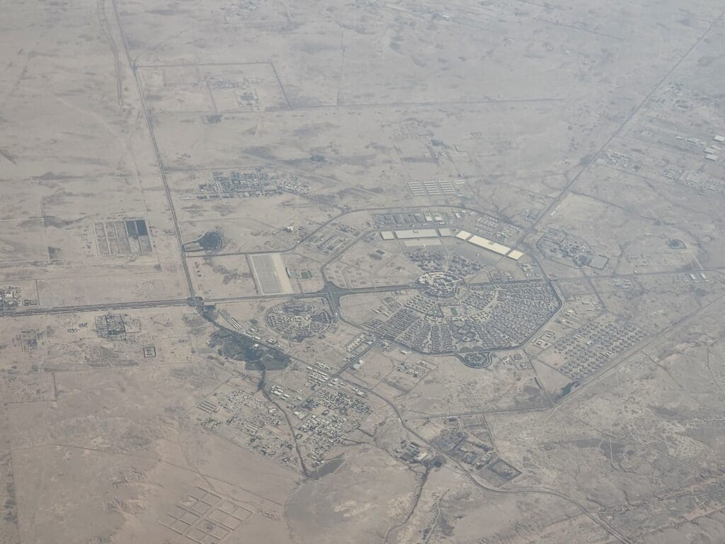 For the first fifteen minutes or so of our flight across Saudi Arabia, the Boeing soared high above the King Salman bin Abdulaziz Royal Natural Reserve – the world’s fourth-largest wild reserve. Heading onwards, the first significant settlement I spotted in Saudi Arabia that afternoon took the form of Sakaka, which was soon replaced by the impressive expanse of the orange dunes of the Arabian Desert. Once in a while, the occasional remote road could be seen cutting through this however, for much of our journey, few signs of human life could be seen below. After a while, all of a sudden the strange sight of what seemed to be an octagon-shaped town appeared out of nowhere. Later research revealed this to be the King Khalid Military City, which was designed and constructed by the American military in the seventies and eighties and remains inhabited.