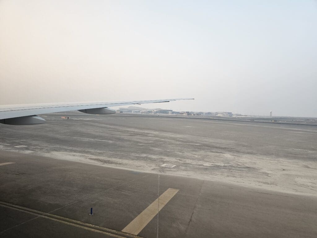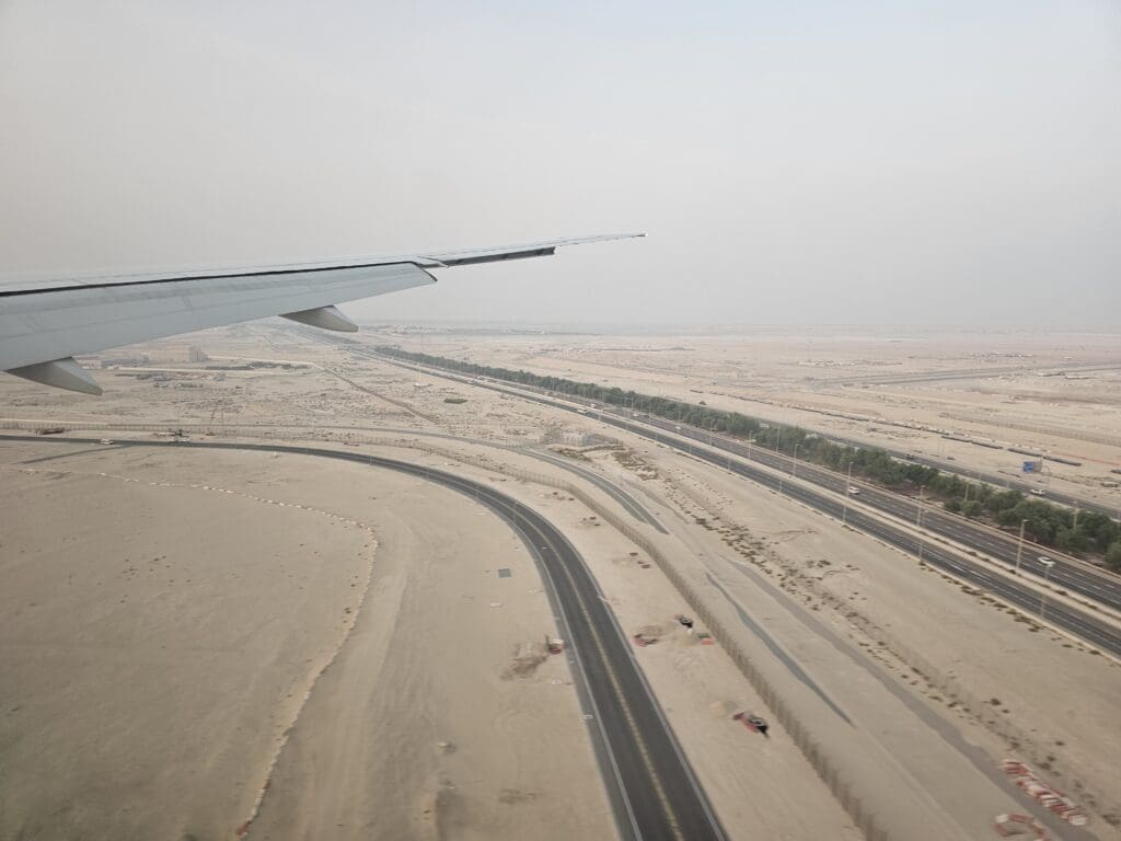 Bouncing around slightly, the aircraft sank over the mostly residential neighbourhoods of Madinat Al Riyad, Al Shamkhah and Al Falah. Soon, the busy E11 motorway which runs from Saudi Arabia in the south, past Abu Dhabi, through Dubai and up to Ras Al-Khaimah could be seen before we crossed over the perimeter fence and made a fairly smooth touchdown at 1749, a total of 4H51 after taking off from Rome.