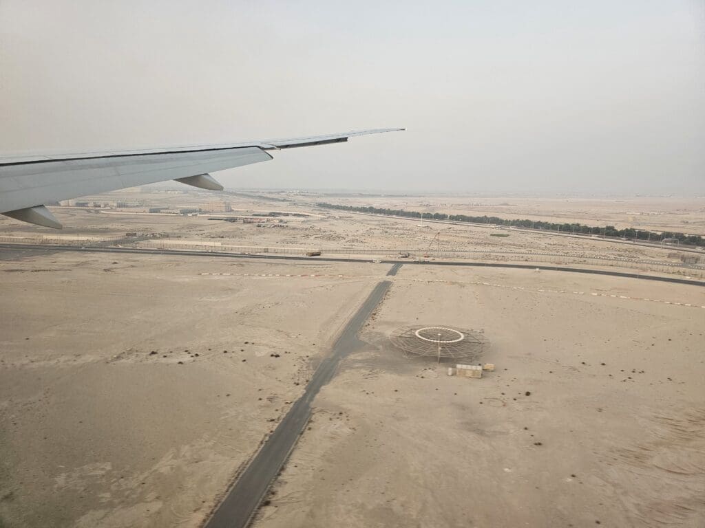 As we neared the coastline of the United Arab Emirates, mist rolled in below, ensuring that little of the coastline could be seen until we crossed right over Abu Dhabi’s Corniche and flew over the city centre. That evening, our approach took us right over the heart of the city before the tower blocks and villas of its outskirts came into view as we headed back towards the desert. As we neared the city’s fringes, the flaps were lowered and the aircraft turned back around to line up for an approach to Abu Dhabi Airport’s Runway 31L.