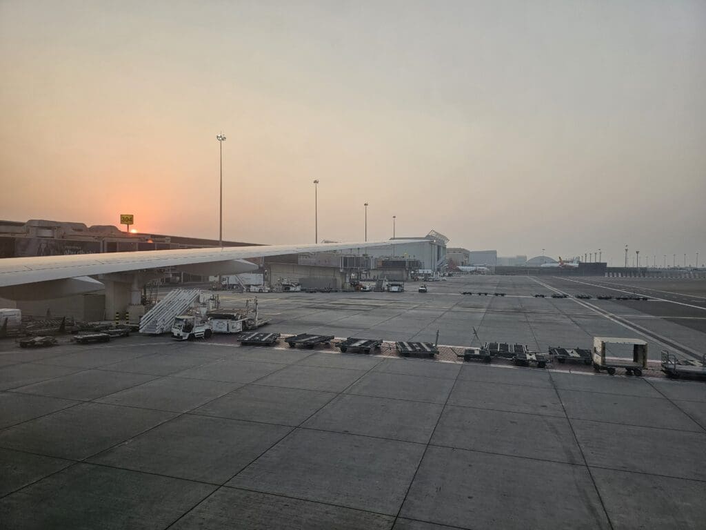 Soon, Abu Dhabi Airport’s sail-like control tower and new terminal appeared, and we turned left and vacated the runway, at which point the Cabin Manager welcomed all to Abu Dhabi in Arabic and English. At this point, another interesting visitor came into view in the form of an Airbus A320 operated by Indonesian carrier Batik Air, which I presumed was visiting for maintenance. From the runway, the aircraft taxied towards one of the closest stands at Terminal 3 and came to a halt no more than three minutes after touching down. In the usual manner, as soon as the aircraft came to a halt, many of my fellow passengers jumped up as if in a desperate rush to escape the aircraft however with just one jetbridge to be connected, those in a hurry would have been disappointed as this took a fair while to be positioned up to the aircraft before disembarkation commenced. As I waited, the sun could be seen sinking and a sleek-looking Boeing 787 Dreamliner pulled up at the neighbouring stand at the end of its long journey from Washington.