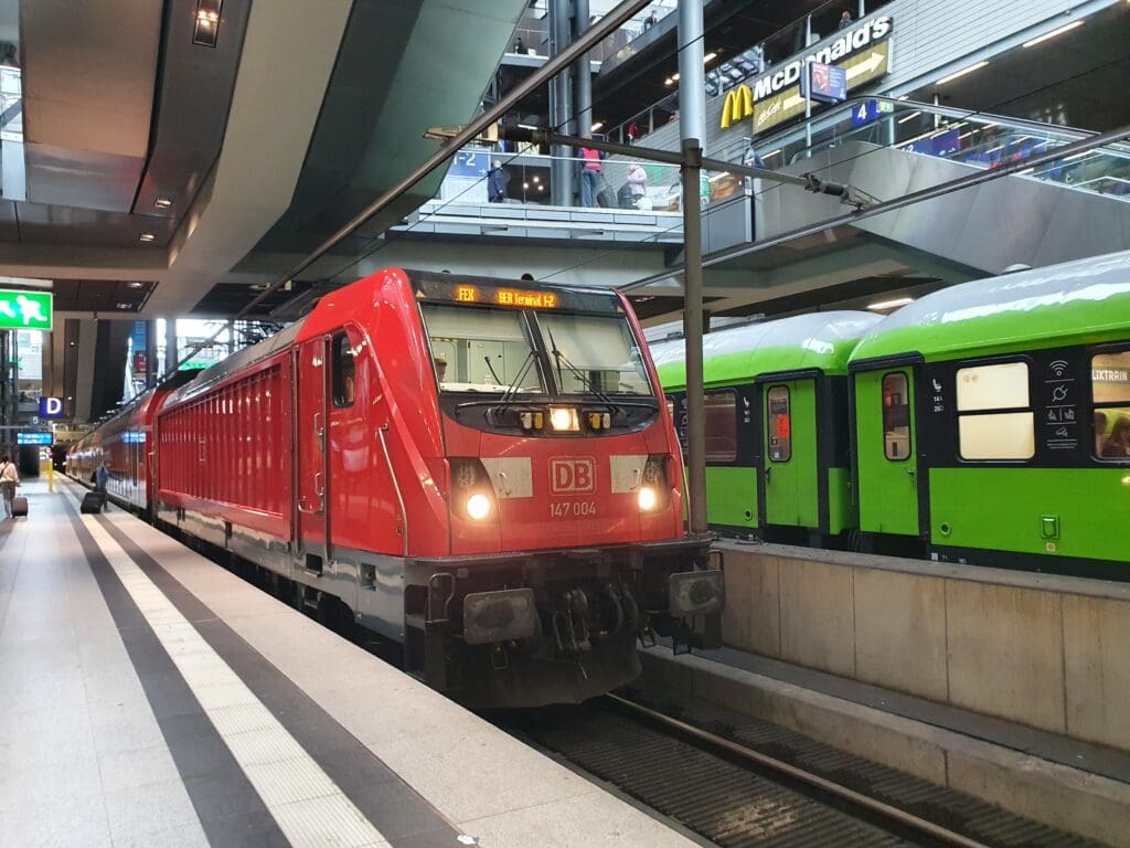 With my flight departing Berlin at 1110, I aimed to arrive at the airport by 0810 which would hopefully allow me plenty of time to check in, explore Berlin’s new airport and relax before my flight to Greece. Once I had handed in my key, I made my way onto the quiet morning streets and commenced the short walk over to the local S-Bahn station, Savignyplatz. Whilst almost June, that morning the weather seemed to be unseasonably cold, with a very chilly breeze that ensured I rushed over to the station in an attempt to warm up. After I arrived at the station, I journeyed up to the island platform, and in true German style, with the network operating on a trust-based system, no tapping in was needed and I simply waited for the next eastbound S-Bahn train to arrive. Following a few minutes of waiting, a Class 481 unit wearing the distinctive red and cream Berlin S-Bahn livery zoomed into the station and I soon boarded this and began the short four-stop journey towards Berlin’s main station. Upon arriving at the maze that is Berlin Hauptbahnhof, having the departure platform of the next FEX service to hand, I journeyed down several long flights of escalators before arriving at the platform with a few minutes to spare until the next departure.
