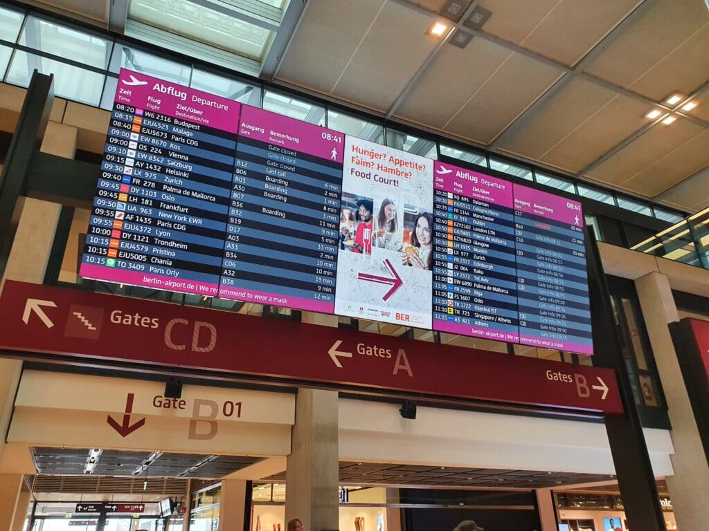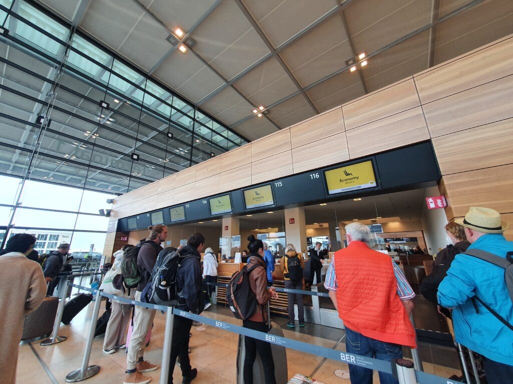 Once off the train, I made my way upstairs to the main station area before heading up again and emerging in Terminal 1’s check-in hall, arriving there no more than three minutes after disembarking the train. At the time of my flight in May 2022, Berlin’s new airport featured two terminals in regular passenger operation – Terminal 1, and the low-cost terminal, Terminal 2. In addition, a third terminal, curiously named Terminal 5, is set to open at some point in the future with this located in the former terminal of Schönefeld Airport on the other side of the airfield. Returning to Terminal 1, as with many German airports both large and small, I found the landside portion of this to be home to a good number of facilities including shops, cafes, restaurants, travel agency offices, and importantly for aviation enthusiasts – an observation deck! However, when compared to many other capital city airports, the terminal did seem to be rather small and compact, although this is to be expected given the roles of Frankfurt and Munich in serving as Germany’s main air hubs. With plenty of morning departures, unsurprisingly upon arriving at the terminal, I found this to be rather busy, with hordes of holidaymakers raring to jet off to the sun. Whilst I would have liked to head straight off to security, seeing as I had been unable to check in online, I was left with no choice other than to seek out Scoot’s check-in counters. After checking the departure boards, I made my way over to check-in island 1, located in a corner of the terminal.
