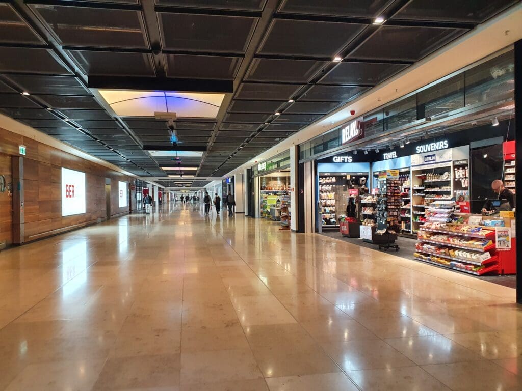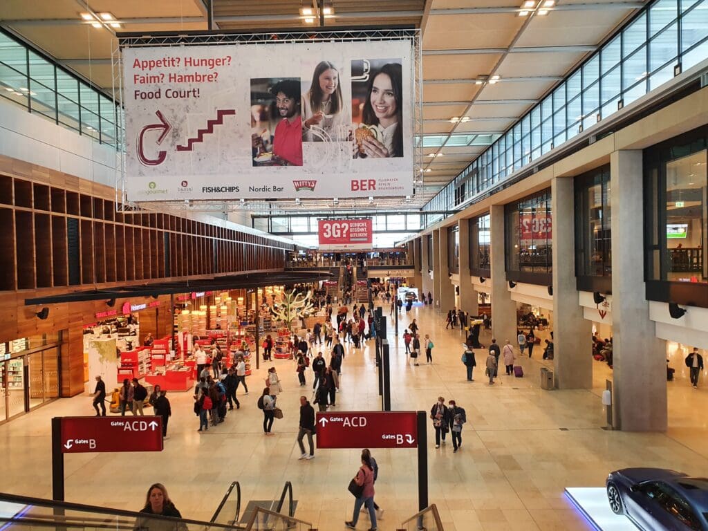 Once I had checked in, I decided to head straight to one of the terminal’s security checkpoints where another short queue could be seen. After scanning my boarding pass on one of the barriers, this let me through and as with check-in, I stood in line for around ten minutes before reaching the checkpoint itself. Passing through security without an issue, as is the case at many airports throughout Europe, all passengers are then required to walk through a large duty free store before reaching the main airside portion of the terminal. Not needing to buy anything, I sped through the duty free store and soon arrived in the main airside hall where a range of shops could be found, as could a small food hall on the first floor of this. Focusing on the latter, this contained a bar as well as three eateries specialising in Asian-inspired cuisine, currywurst and fish and chips. Given the young age of the terminal, unsurprisingly I found this to be modern, bright and spacious, although upon closer inspection I couldn’t help but notice a fair few signs of wear and tear, such as scratches, worn paint and screws that were coming loose implying that low-quality materials and fixtures had been used in the terminal’s furnishings.