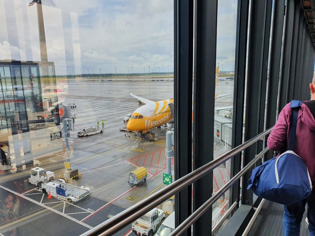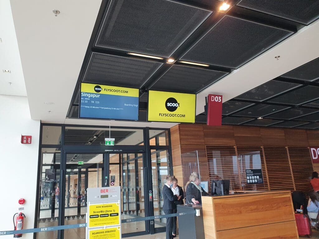 Seeing as there were still three hours left to go until departure, I wasn’t too sure whether Scoot’s check-in desks would be open however much to my delight, these were. That morning, four desks were provided for those travelling in Economy, in addition to one for those in ScootPlus and another for passengers who had been able to check-in online and were hoping to drop off their luggage. After arriving, I joined the short queue and waited in line for around ten minutes before reaching one of the four check-in counters for those in Economy. Overhearing interactions between the check-in agents and several fellow passengers, it seemed as if most of those waiting were heading off to far-flung destinations in Southeast Asia and beyond, with several backpackers heading home on long journeys all the way to Australia. Upon reaching the counter, I was greeted in German by a friendly agent and then once again in English after I handed over my British passport. Once the agent had inspected my hand luggage, a yellow tag was placed on this after which my boarding pass was printed out. I was then advised that a further check (which I assumed to mean a passport check), was required after security and I was informed that I should go through this right away or risk missing my flight.