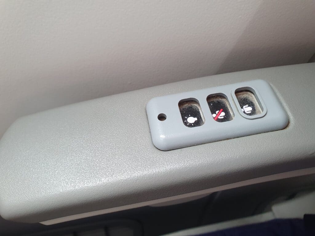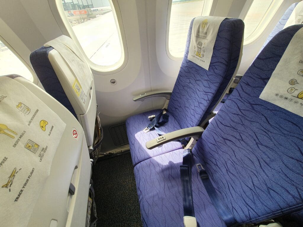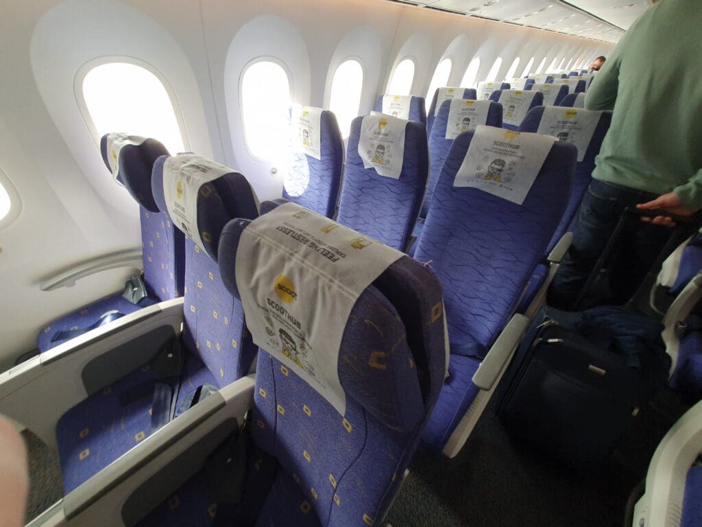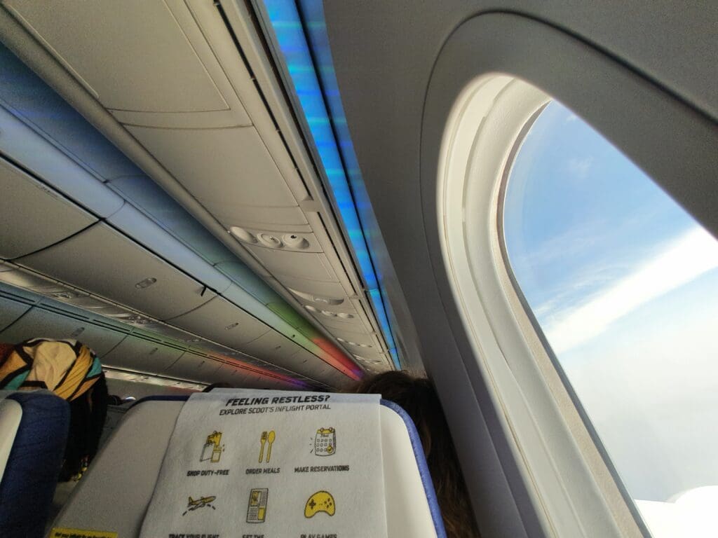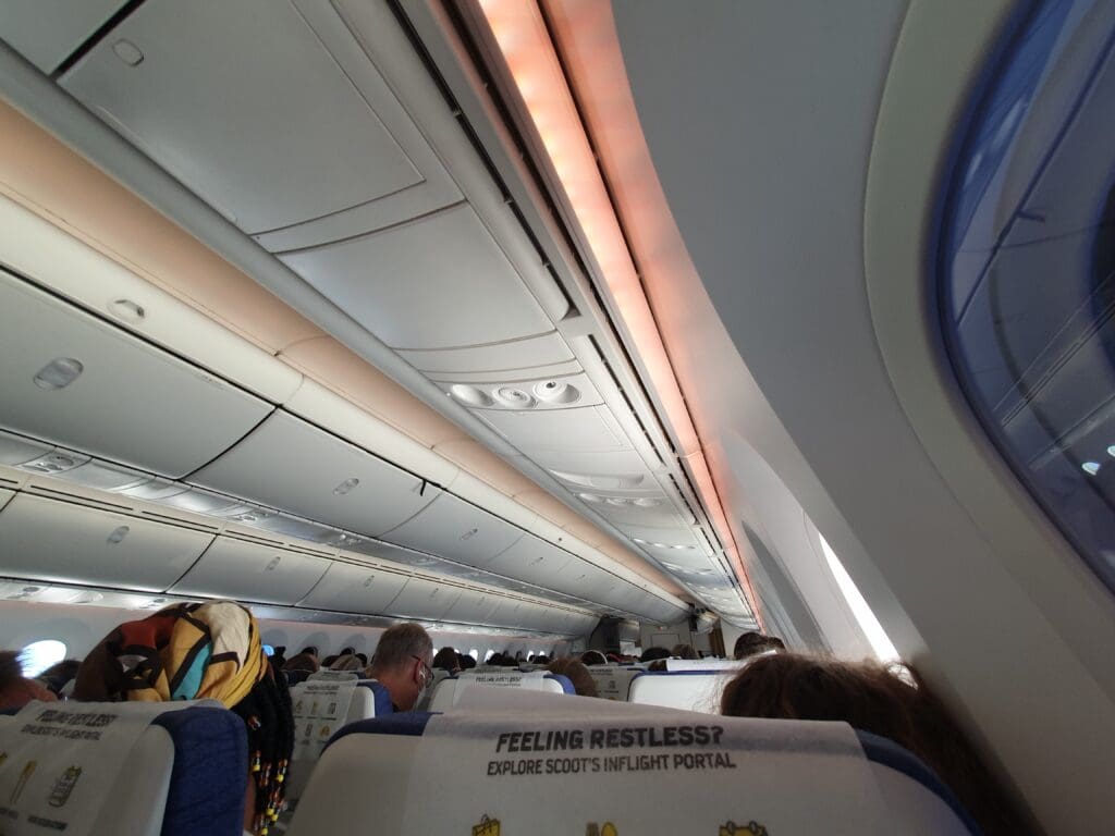 Being a low-cost carrier, to squeeze in as many seats as possible, Scoot’s Dreamliners feature one less galley than can be found onboard most Boeing 787s across the world. Thus, upon stepping into the aircraft, slightly unusually for a Dreamliner, I found myself directly entering the passenger cabin rather than a galley. As I entered the aircraft, I received a friendly greeting from two cabin crew members, one of whom checked my boarding pass before advising me to turn right down the second aisle. After turning right, I made my way through the aircraft’s small ‘Super’ seat section of the aircraft, where seats have an increased amount of legroom and feature an adjustable headrest. Given Scoot’s status as a low-cost carrier, I was slightly surprised to find that the airline arranges their Economy seats in a 3-3-3 rather than a 3-4-3 configuration. Focusing on their design, manufactured by Safran, these sit in a plastic shell and their fronts are covered in a blue fabric that features a repeating pattern of dark blue waves. Meanwhile, these were topped with disposal fabric antimacassars that advertised Scoot’s cloud-based inflight portal, ScootHub. As you would expect from a low-cost carrier, these are rather spartan in their design and lack the same array of amenities that can be found on a ‘typical’ widebody aircraft seat such as plug sockets, USB-A ports and inflight entertainment screens. Whilst the lack of these would not prove to be an issue on the flight down to Athens, those travelling onwards to Singapore and lacking their own entertainment may have ended up a little disappointed. Finally, buttons for the overhead reading light and to call a flight attendant could be found planted in the seemingly thin armrests between seats – this perhaps resulting in their easy misactivation.