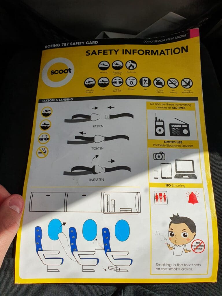 After settling in, passengers continued to stream onto the aircraft as upbeat high-tempo pop songs filled the cabin for the duration of boarding. Once seated, it wasn’t long before I was joined by a couple of neighbours. Indicating that almost all passengers were onboard, at 1122 the Captain performed their welcome announcement during which they introduced themselves and the flight’s First Officer and Purser, before noting that we could expect to be in the air for two hours and a half and detailing the weather both en route and in Athens. This ended with a mention that we were waiting for the final cargo pallets to be loaded and for the dispatch documents to be delivered after which we would be on the move. Two minutes after this announcement, boarding was announced as complete with the aircraft appearing to be full that morning. At 1129, the music that had accompanied boarding came to an end before the Purser performed an upbeat announcement during which they welcomed all passengers and thanked us for flying with Scoot, cheesily introducing the crew as ‘Scootees’. This announcement then transitioned into the safety instructions which were read out by the Purser whilst several cabin crew members took to the aisles where they performed a demonstration. Despite the aircraft’s origin and destination, I was slightly surprised to find that there were no pre-recorded safety instructions played in either German or Greek. Once the demonstration came to an end, the crew members then passed through the cabin ensuring all was set for our departure.