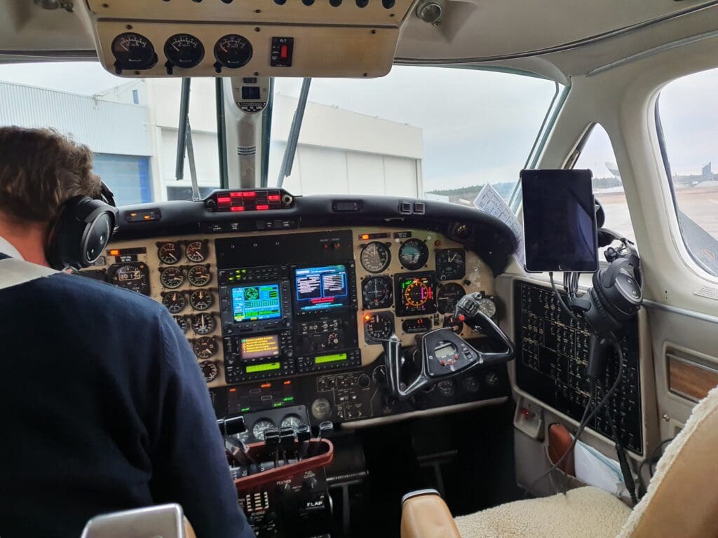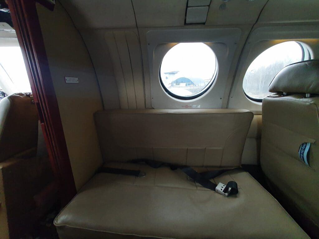 Turning left, I made my way into the King Air’s cabin, which, standing at just 1.46 metres tall and 1.37 metres wide, felt a little cramped whilst stood up. Whilst I would have been happy to fly on any old King Air that morning, one reason I was particularly happy that SE-KVL was operating the flight was that this has retained its corporate interior. Meanwhile, the route’s usual King Air, SE-MJU has been retrofitted with forward-facing seats in a style and layout similar to that seen on other small turboprop airliners. Focusing on SE-KVL’s cabin, this comes complete with two pairs of large and comfortable-looking leather seats on either side of the aisle, with these positioned facing one another allowing for either easy discussion or awkward eye contact and battles over leg space. Separating these seats from the cockpit, a small inwards facing chaise longue capable of seating two passengers could be seen on one side of the cabin, whilst a rearwards-facing recliner could be seen on the other – with the King Air featuring a total of nine passenger seats. Wanting both a good vantage point from where I could peer into the cockpit, and not wishing to end up spending the flight awkwardly staring into the eyes of a fellow passenger, I decided to take the single rear-facing seat behind the Captain, what would be Seat 1A were the aircraft to have seat numbers.