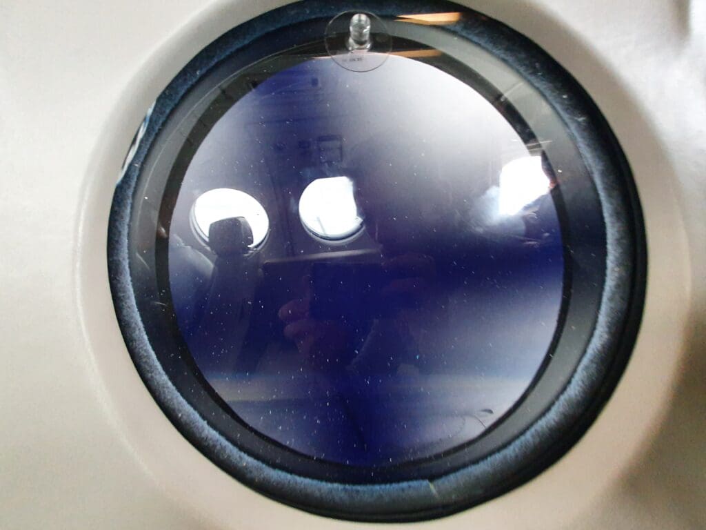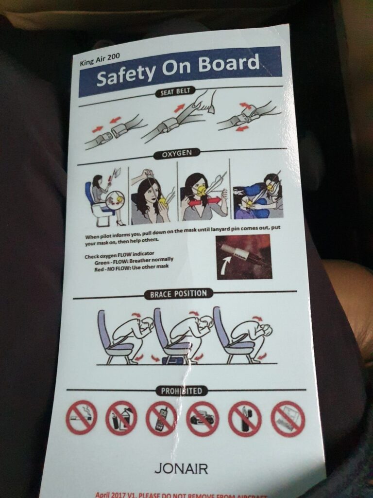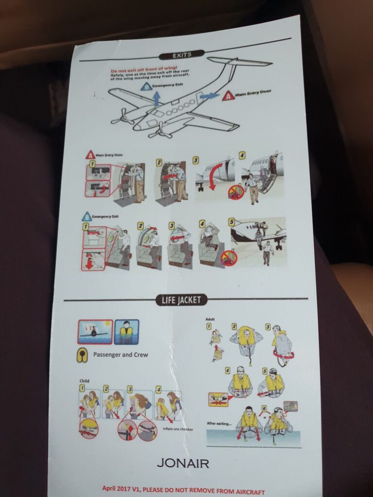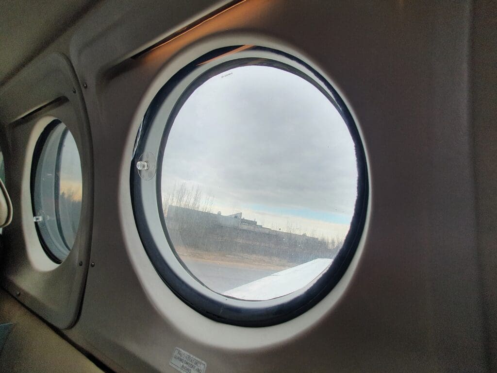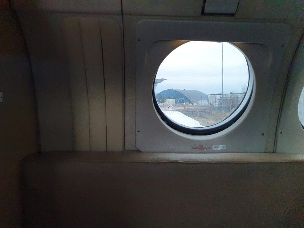 As was to be expected given the fact that I was on a corporate transport aircraft, upon sitting down I found the seat to be soft, comfortable and provide an abundance of legroom. Although slightly annoyingly this did automatically recline a fair way each time I leant back – however, I did soon get used to this. Inside, the cabin appeared to be clean and tidy, although this did display signs of its old age with an abundance of marks, scratches and smudges seen almost everywhere I looked. Whilst this was not an issue for me on the scheduled flight up to Sveg, I may have been slightly disappointed with the state of the interior had I hired the aircraft for a luxury charter. As with most airliners, each seat came complete with an individual air vent and a reading light, with those positioned above my seat working without any issue. Onboard, cabin illumination came in the form of a lighting strip that ran above the King Air’s large circular windows. Meanwhile, the portholes themselves lacked any sort of window blind – with these being dimmed by means of a handle which served as a sort of low-tech version of the Dreamliner’s dimmable windows. Examining the contents of the seatback pocket, this contained nothing other than a Jonair-branded safety card. Finally, no tray table could be found, and the tables once in position between each pair of seats facing one another appeared to have been removed
