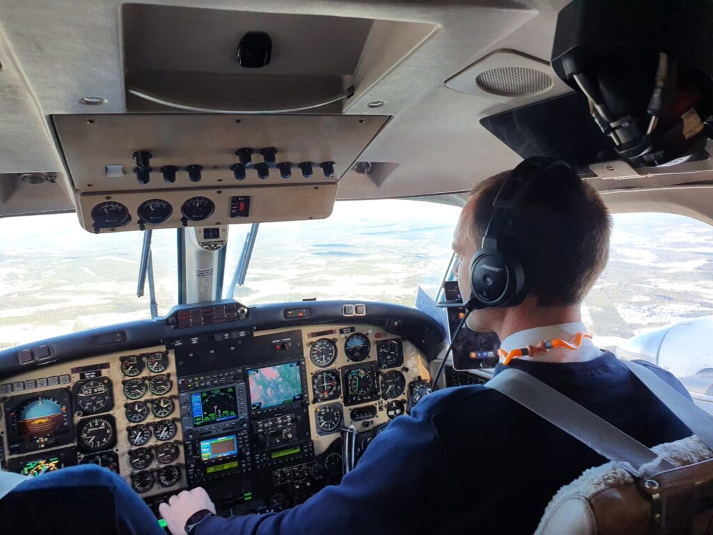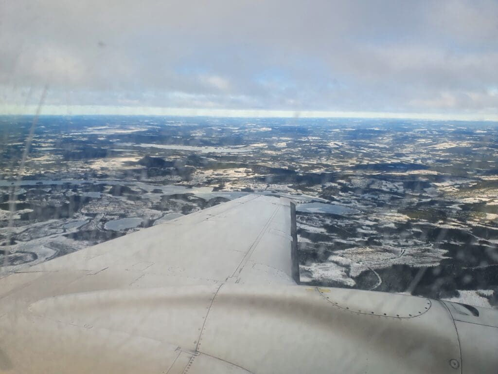 With the Garmin GPS up in the cockpit serving as my version of the moving map, I watched as the number of nautical miles to run until Sveg decreased and soon we hit a couple of rough patches of turbulence – with each lasting a couple of minutes. At 0945, the King Air could be felt commencing its slow descent towards the snowy Swedish landscape sitting below. As we descended through 13,000 feet, the Captain unstrapped themselves and squeezed out of the cockpit before performing a pre-arrival speech in Swedish from the chaise longue. Not only was this concerningly long, but this resulted in a few worried looks on the faces of my fellow passengers and thus, worried that I might be missing out on some vital information, I asked the Captain if they could summarise this in English. Happily providing a condensed version of this, the Captain warned that we would be in for some very heavy turbulence on our approach to Sveg and that we would land in around ten minutes.