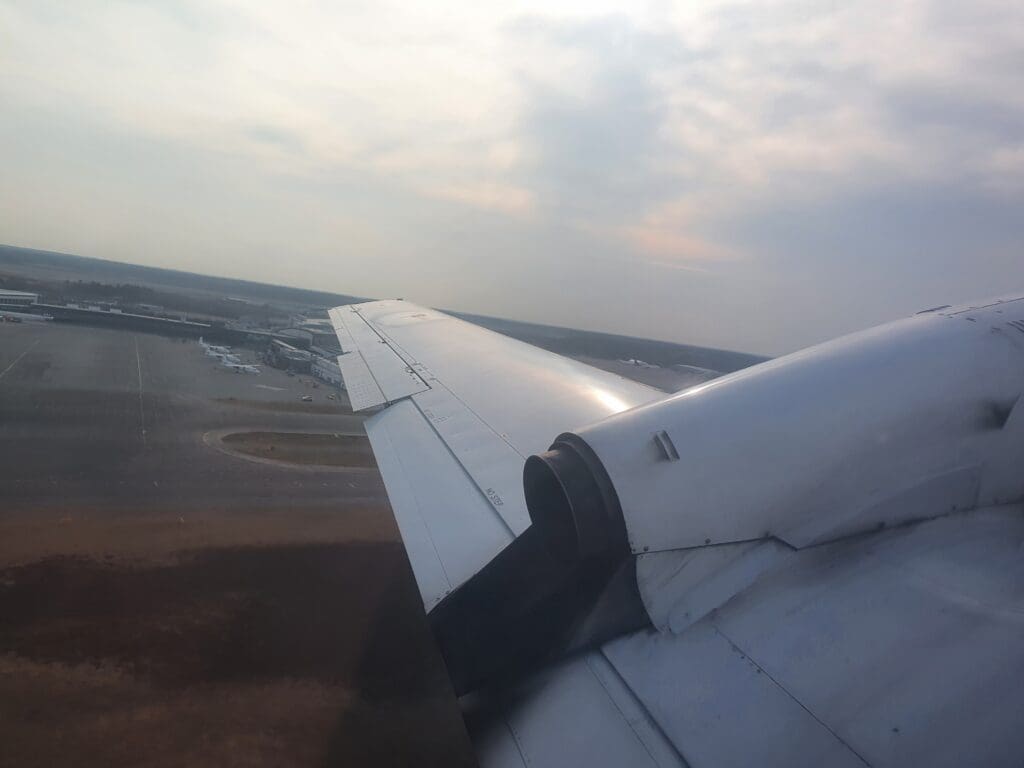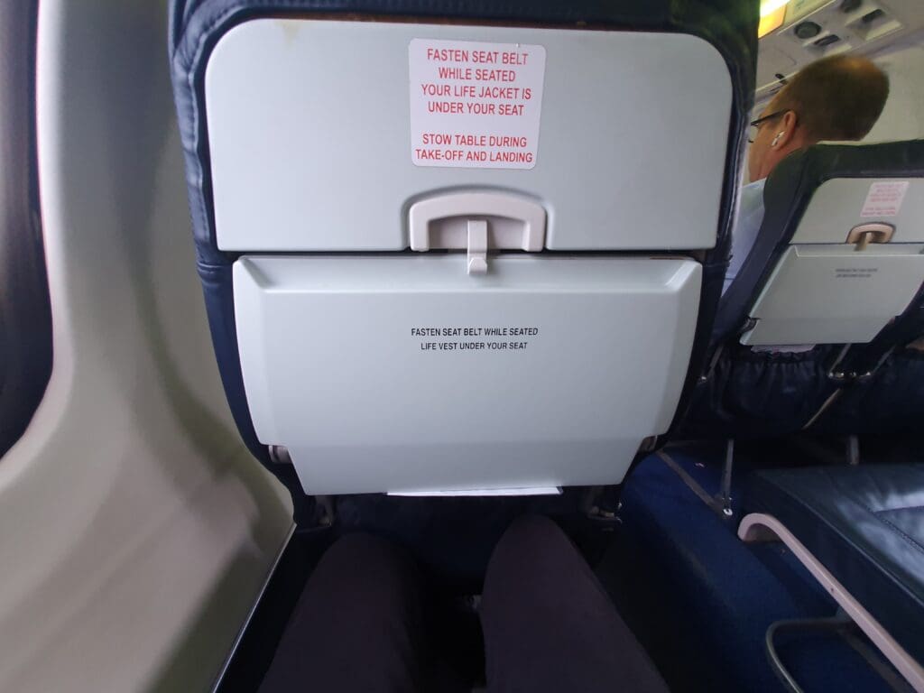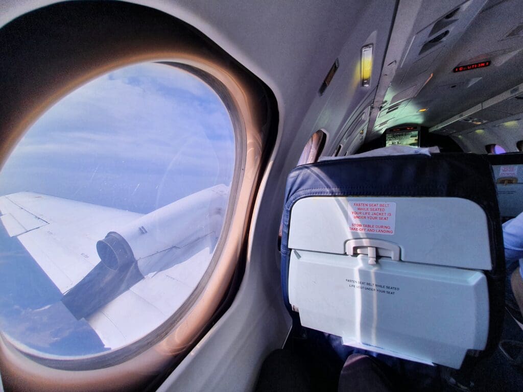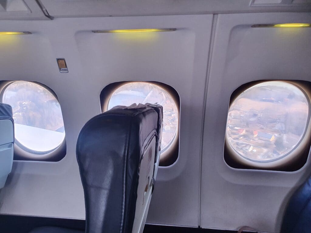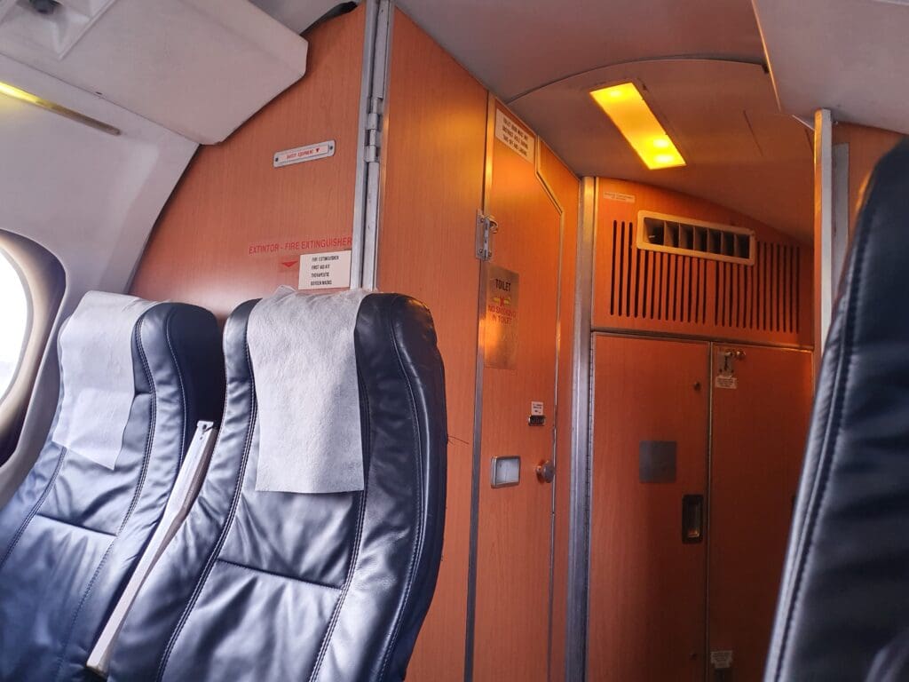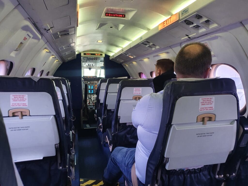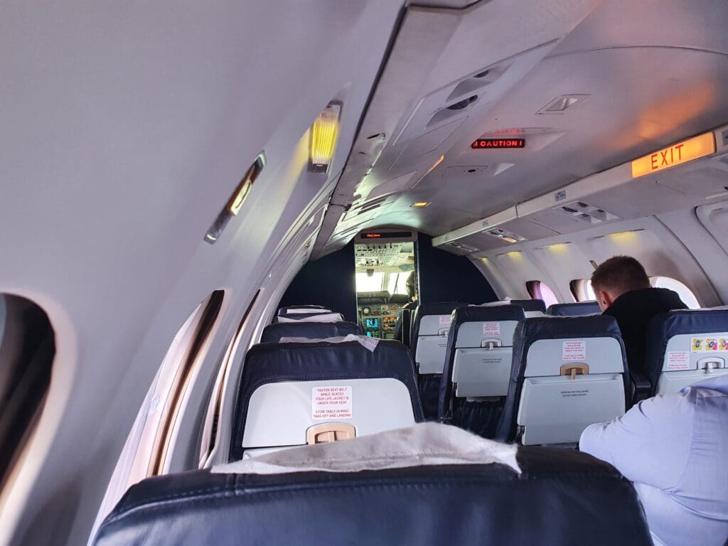 Once I had placed my backpack into the rear baggage compartment, I turned left and entered the Jetstream 32’s nineteen-seat passenger cabin. Despite the aircraft’s lack of mood lighting, a blue hue filled the cabin thanks to the blue tinge applied to the aircraft’s large circular windows. As on several small turboprop airlines, the Jetstream’s seats are located on raised platforms on either side of the aisle and are in a 1-2 configuration with six full aisles and then a single seat in row 7. It is worth noting that whilst most window seats offer a view outside, those seats in rows 1 and 7 only feature about a third of a window. Whilst the cabin height of 1.6 metres meant that I had to bend my head whilst inside, perhaps owing to the lack of fellow passengers or the cabin’s reasonable 1.9-metre width, the aircraft did not seem to be particularly cramped.