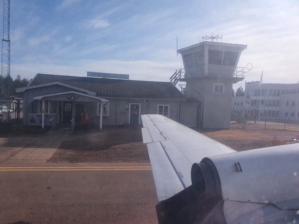 After whizzing over the banks of the river, the Jetstream crossed the perimeter fence and made a firm touchdown on Hagfors Airport’s sole runway, 41 minutes after departing Stockholm Arlanda. Sitting at 1,510 metres long, this runway does not pose much of a challenge for the Jetstream 32, especially in good weather conditions. In addition, with the airport’s only taxiway located at the opposite end of this, there was no need for any harsh braking. As the Jetstream vacated the runway, the only other aircraft that could be seen on the ground in Hagfors that morning appeared. This took the form of a battered Cessna missing several vital components and resting on its tail. As with Torsby, Hagfors is only served by Amapola’s route between Torsby and Stockholm which provides the airports with two arrivals and departures each weekday. Unsurprisingly, the terminal appeared to be small, consisting of a homely-looking small grey hut complete with an adjoining control tower. Other than this, the only other buildings I could spot at the airport were a couple of small neighbouring hangars which I assumed to be home to the local flying club who operate a couple of Cessna 172s and a Eurostar EV97.