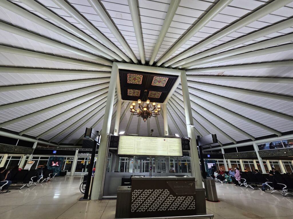 Once through security, three corridors lead to the terminal’s three separate piers. Whilst my flight would be boarding through Gate A5, I first decided to wander around and explore the terminal’s sights. Inside, each pier is virtually identical in style and layout, consisting of a cavernous waiting area with a tall pointed roof from which a chandelier hangs down. In each, plenty of seats can be found as well as a few charging points and televisions which either broadcast the local news or a series of music videos. Each pier also featured a café-kiosk selling drinks and a range of snacks and other items, whilst toilets and a prayer area could be found on the ground floor underneath each waiting area. Whilst some may claim that the terminal seems to be a little dated in parts, this is most certainly unique, and I rather liked its Javanese character and style. Furthermore, this appeared to be clean and tidy, and even though it was eternally busy, there seemed to be an adequate amount of seating throughout.