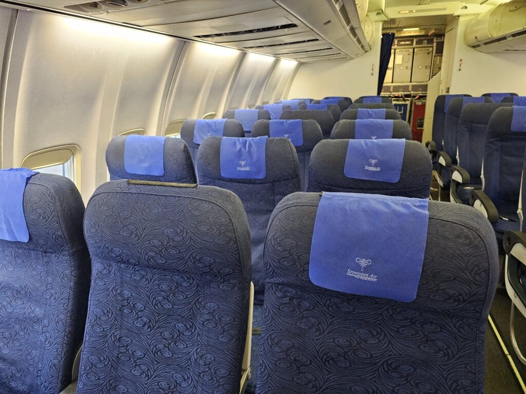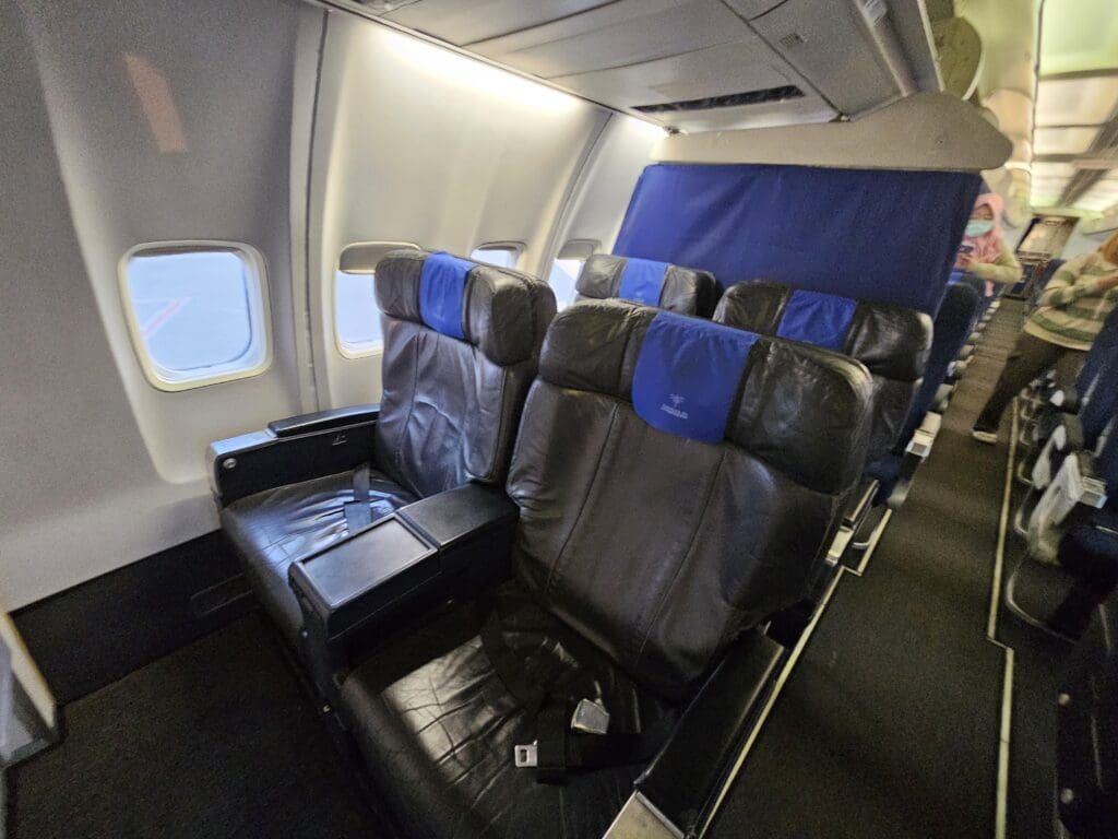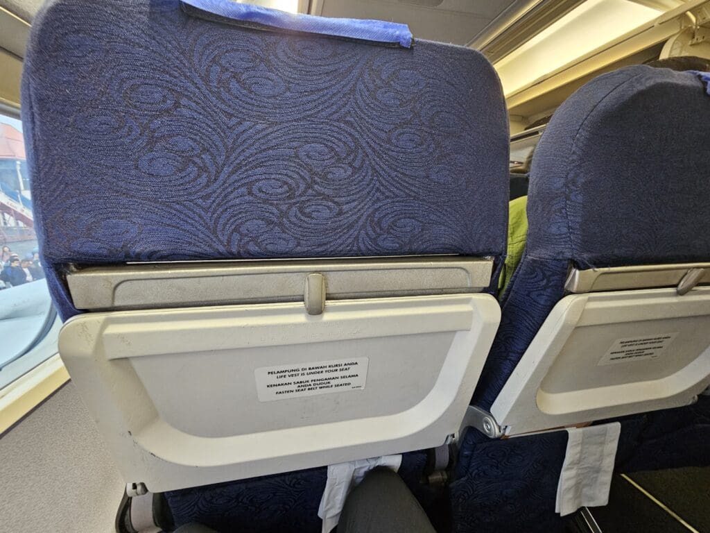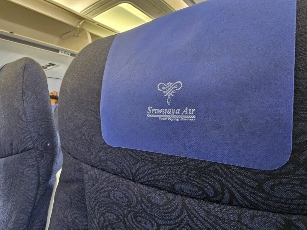 Once I had snapped plenty of photos, I made my way up the covered airstairs and stepped into the Boeing’s forward galley. Immediately upon entering the aircraft, I was given a friendly welcome in English by one of the flight attendants sporting Sriwijaya Air’s very royal blue uniform and contrasting bright red hijab. The latter was more aligned with the colours of sister airline NAM Air. Turning right, I then journeyed into the aircraft’s Business Class cabin, which is marketed by Sriwijaya Air as their ‘Golden Seats’. This consisted of two rows of very comfortable and retro-looking leather recliners that, like the aircraft’s other seats, had been inherited from Continental Airlines. Continuing onwards, I reached the aircraft’s Economy class section, which is home to a total of 112 seats. Each of these sported a dark blue fabric cover with a swirling pattern and was topped with a Sriwijaya Air-branded antimacassar. Whilst a little chunkier than the ironing board seats of many low-cost carriers today, for older seats, these appeared to be a little on the thin side.