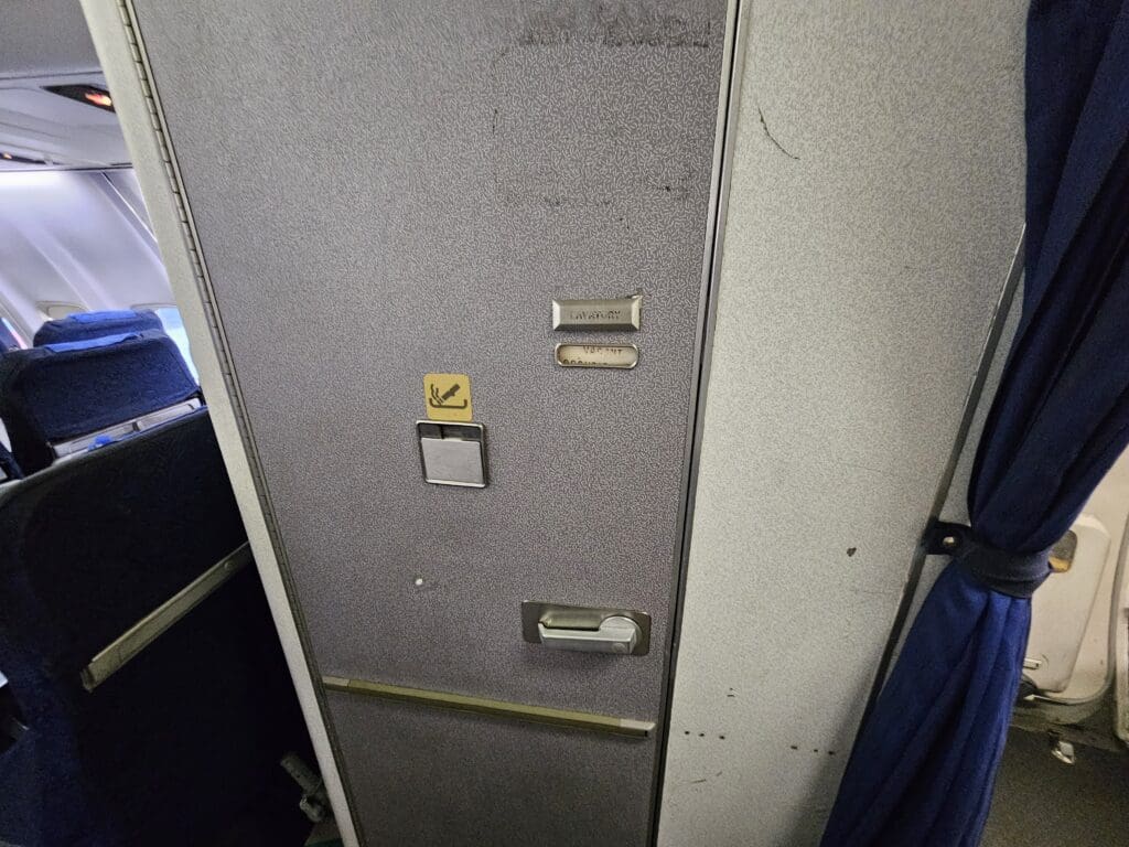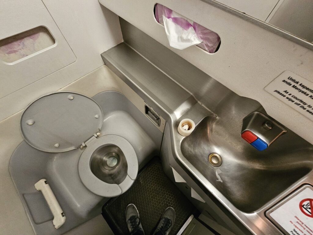 As I made my way to Seat 15A, I received two more friendly welcomes. Perhaps looking lost, one flight attendant guided me to my seat, and overall, I was left with a very positive first impression of the crew onboard the service that morning. Seeing as I would likely be trapped for the next hour or so, I decided to use the toilet before departure. Heading to one of the two toilets at the rear of the cabin, upon opening this, this was expectedly dated and a little battered, yet was clean and served its important purpose. However, I should note that this did lack soap. Returning to the cabin, I voyaged the short distance against the flow of traffic and soon returned to Seat 15A. Whilst I had not picked this seat, I was pleased to find that this aligned well with the window and offered a superb view of the dirt-covered wing and the world outside, with a Super Air Jet Airbus A320 visible at the neighbouring gate.