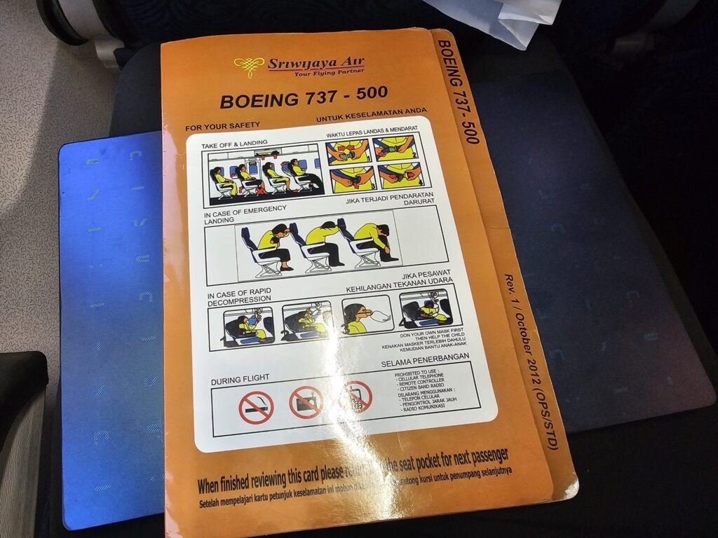 As we headed rearwards, the Purser performed their welcome announcement in Indonesian and English which consisted of the usual thanks and welcomes, a mention of the Captain’s name and our fifty-minute flight time up to Tanjung Pandan. As this was underway, a series of clunks and whines could be heard as the two CFMI CFM56-3C1 engines, used exclusively on the Boeing 737 Classic, powered into life. As they did so, the cabin was temporarily filled with the scent of jet fuel whilst the crew took to the aisles and the safety demonstration commenced. This consisted of the purser reading through the safety instructions whilst the three other crew members performed a demonstration in the aisle at various points in the cabin.