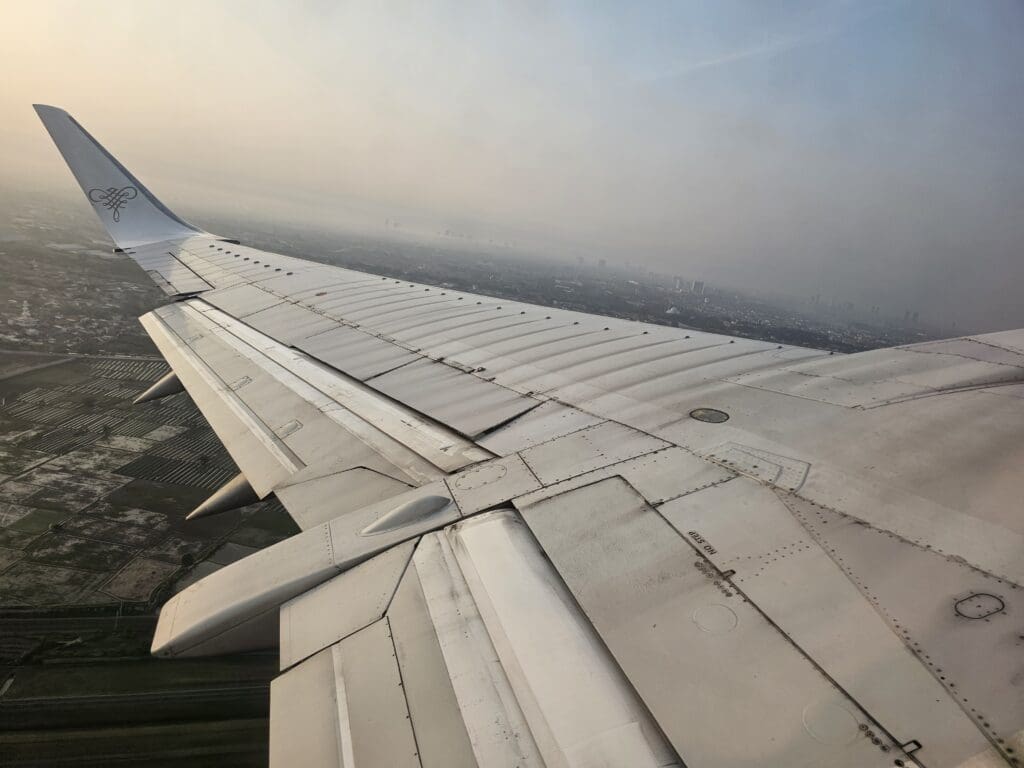 Wasting no time, even though we would be departing during the morning rush, once at the end of the runway no holding was required and we soon made our way onto this. Without stopping, at 0604, the two engines roared into life, and the Boeing commenced its powerful rolling takeoff. With the runway perhaps being a little uneven, this seemed to be far bouncier than usual, and soon we rotated upwards into the hazy morning Indonesian skies.