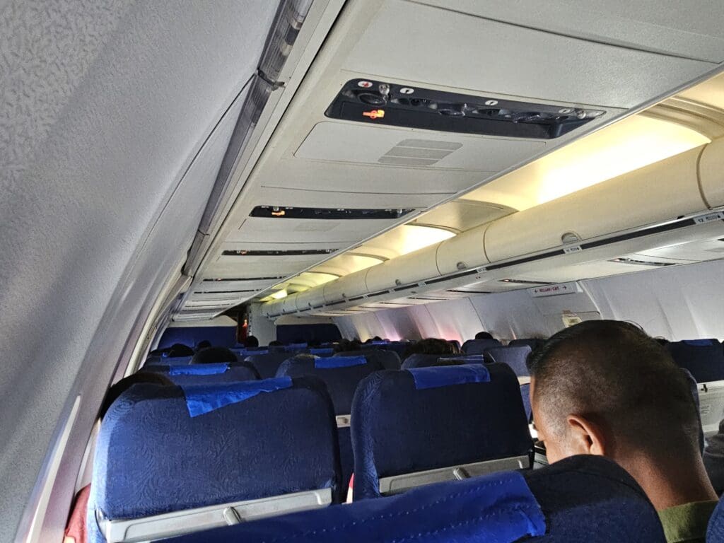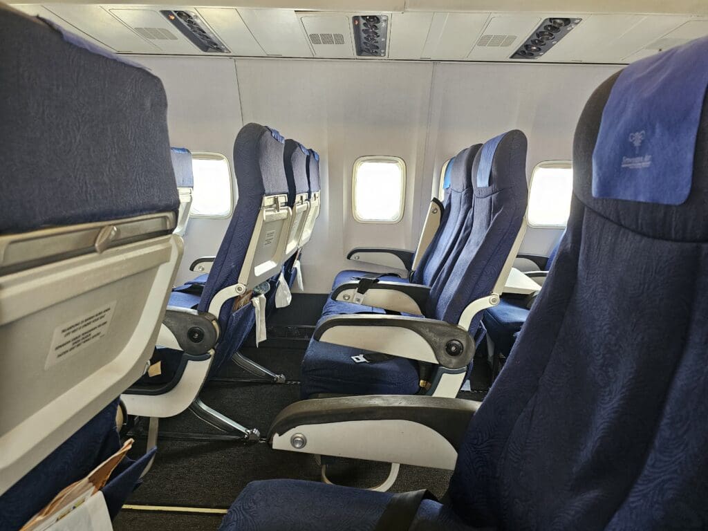 Upon sitting down, I found the seat to be soft and comfortable, and whilst the legroom was not fantastic, it was most certainly sufficient for the two short flights that morning. As you would expect given the aircraft’s age, the cabin did seem to be a little retro with a mishmash of various tones of cabin lighting, clunky-looking passenger service units and chunky armrests, whilst the seats themselves were most certainly not a new design. Meanwhile, plenty of marks and scratches could be seen throughout the aircraft. Nevertheless, the cabin was clean and tidy and left me with relatively little to complain about, especially since I had been expecting a dated aircraft! In the seatback pocket, a dated-looking safety card and a plastic bin-bag-type sickbag could be found.