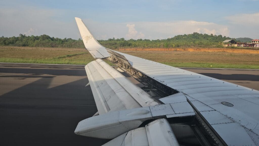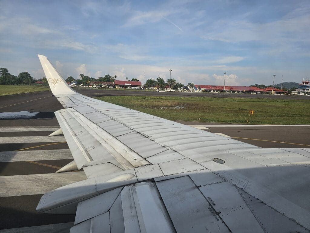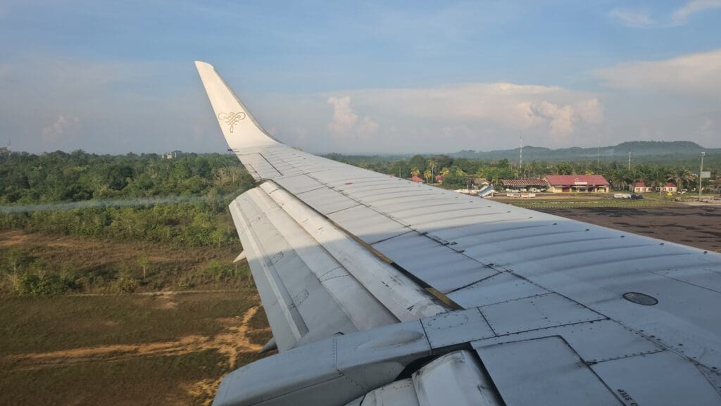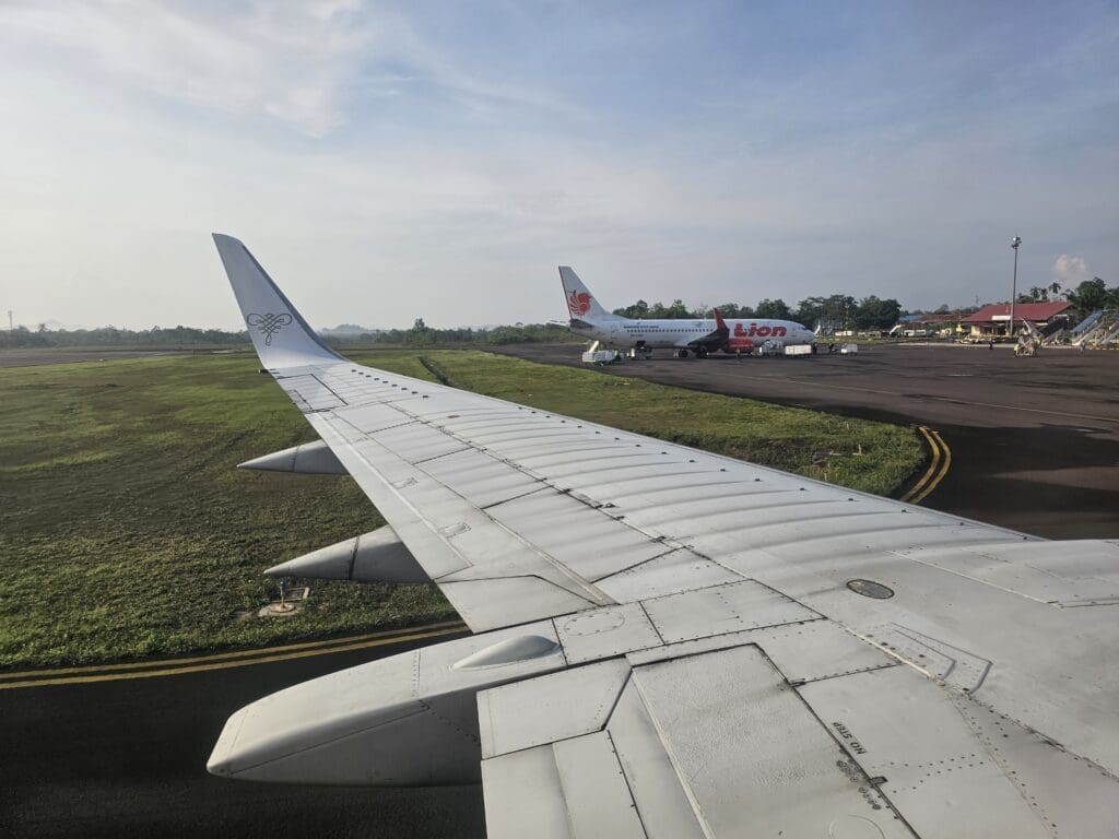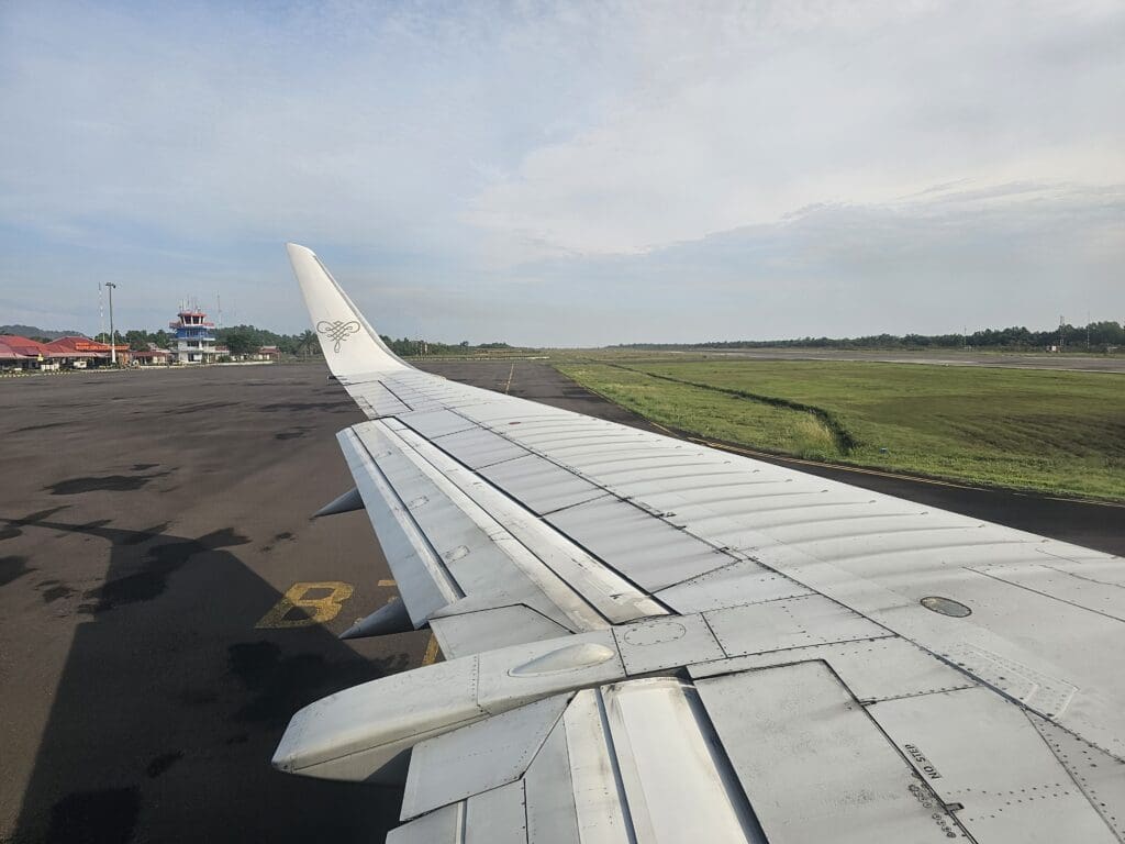 After descending through the thick clouds, the blue waters below, as well as Bangka’s coastline, came into view through the haze before we crossed over to the north of Pangkalpinang. After making our way across the coastline, the flaps were partially extended as we sank over the semi-rural and industrial areas on the fringes of the city before we turned to the south and lined up for an approach to the airport’s Runway 16.