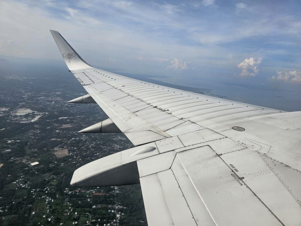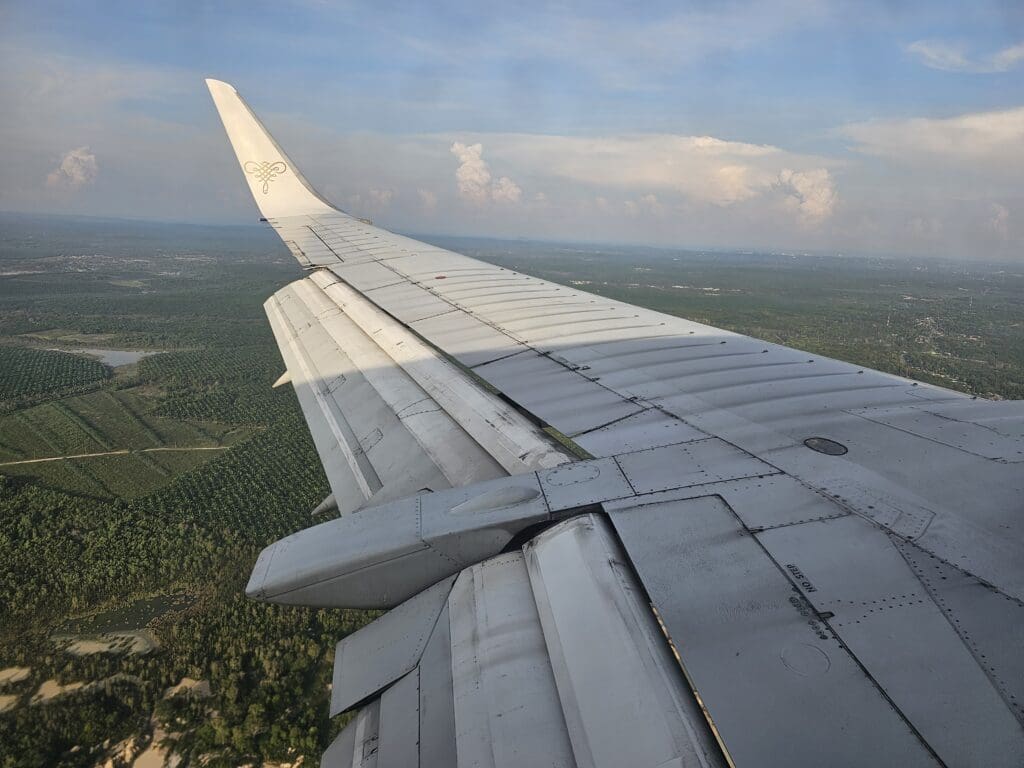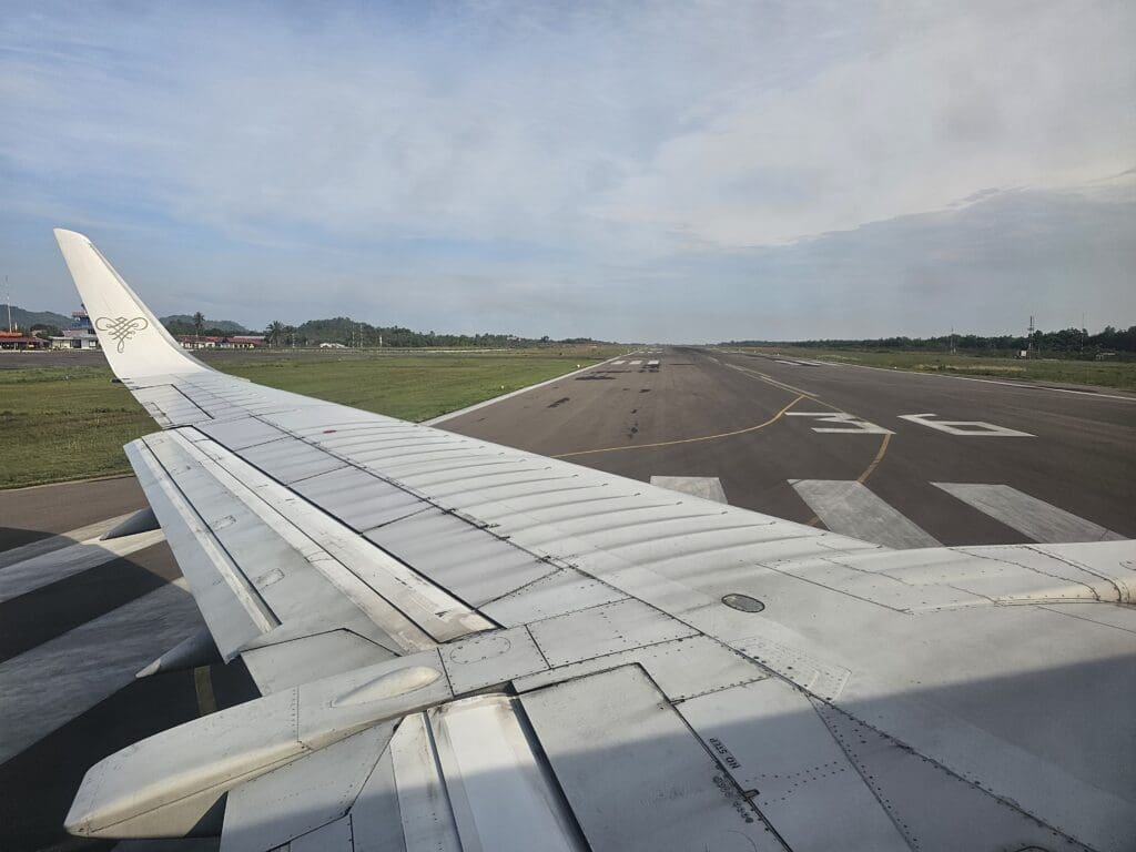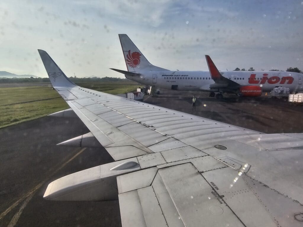 After descending through the thick clouds, the blue waters below, as well as Bangka’s coastline, came into view through the haze before we crossed over to the north of Pangkalpinang. After making our way across the coastline, the flaps were partially extended as we sank over the semi-rural and industrial areas on the fringes of the city before we turned to the south and lined up for an approach to the airport’s Runway 16.