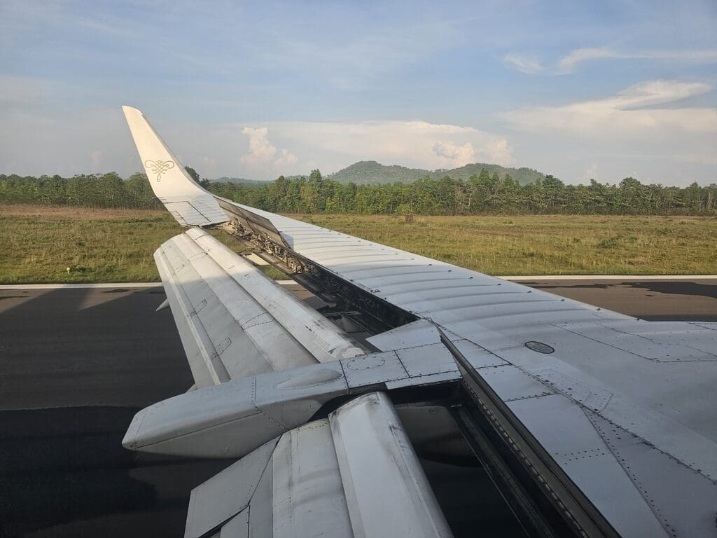 Following a total of just 24 minutes in the air, the Boeing made another firm touchdown on the runway before we braked rather heavily and made a quick exit, vacating the runway to the left. In the usual manner, once on the ground, passengers were welcomed to Pangkalpinang and thanked for flying with Sriwijaya Air before being instructed to remain seated until the aircraft had arrived at the gate and the seatbelt signs had been extinguished. As we journeyed over to the new terminal, the old and rather dated-looking terminal could be seen on the opposite side of the runway, where the carcass of an old unidentified aircraft could be seen rotting away. A short time later, the Boeing turned right and slowly made its way into Stand A03, where the engines spooled down, and a set of Sriwijaya Air-branded steps were wheeled into position at the front of the aircraft.