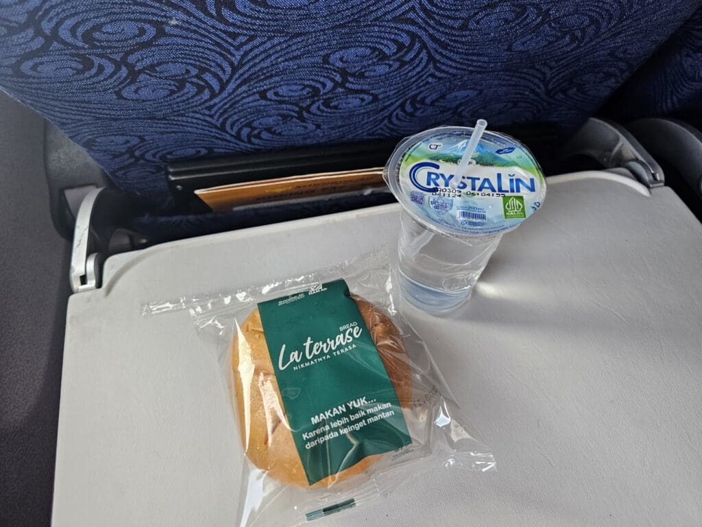 Back inside the cabin, I was soon handed a NAM Air-Sriwijaya Air-branded packaged bun, which contained a sweet custard filling, along with a small tub of still water and a straw. Whilst this service will most certainly not win any awards for its creativity, this was appreciated given the short flight duration. Working non-stop, as soon as all snacks had been handed out, another cart was rolled and the crew attempted to sell items from Sriwijaya Air’s inflight shop, with these goods mainly taking the form of perfumes. However, seeing as most passengers were asleep, the crew seemed to have no luck in selling anything and soon retreated to the galley.