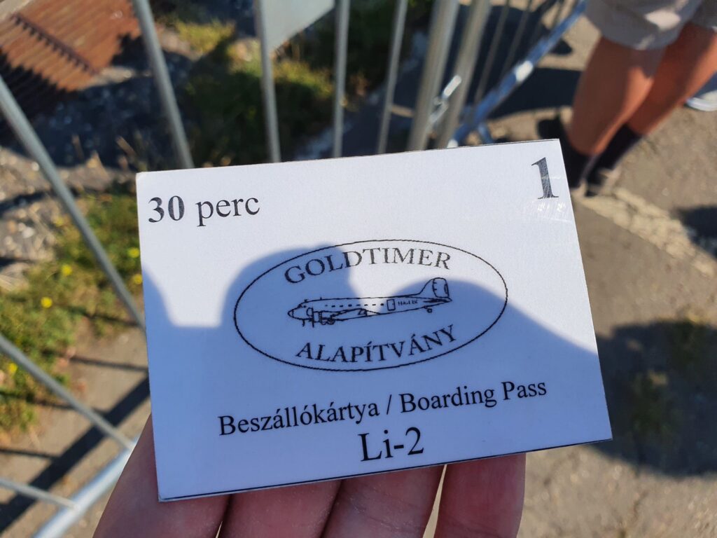 Following several other passengers, I headed in the direction of the Lisunov Li-2 and ended up outside the terminal building where several tables had been set up. There, a host of the Goldtimer Foundation’s volunteers could be seen welcoming passengers and undertaking administrative duties. Upon walking up to the desk, I was given a very friendly greeting in Hungarian by one of the volunteers who then switched to fluent English once they realised I was a foreigner. Being one of just three non-Hungarian passengers on all of the Goldtimer Foundation’s flights that day, the staff seemed to know who I was and I was requested to provide my address, and passport number and give a signature which I assume was for some sort of disclaimer. Once done, I handed over a thick wad containing 84,000 Ft for the three flights and received a small rectangular laminated reusable boarding pass, a Lisunov Li-2 postcard and a handwritten receipt in exchange before being advised to meet at the fence line next to the Li-2 ten minutes before departure.