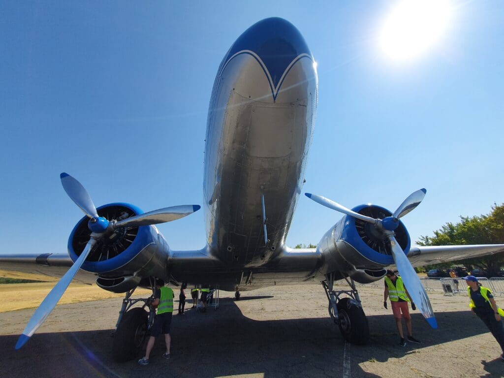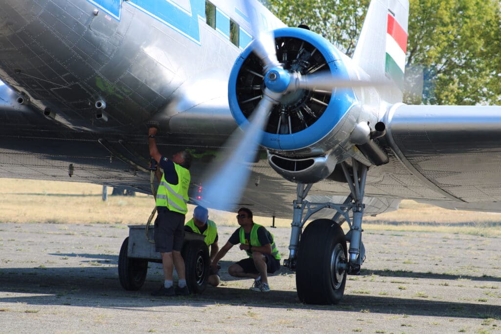 A short time later, the Lisunov taxied away and made a short journey to the end of one of the airport’s two grass runways before it roared up into the skies of Budapest. With all Goldtimer aircraft bar the Kánya up in the skies, I had another short walk around and watched as two Bell 206 helicopters took off in formation with a load of sightseers. After watching this, I returned to the terminal for a quick toilet stop before waiting for the Lisunov Li-2 to return. As I waited at the fence, I was soon joined by my fellow passengers – with the demographic appearing to be a fair mixture of aviation enthusiasts and sightseers. Soon enough, the roar of the Lisunov’s two engines could be heard before this touched down on the nearmost grass runway, kicking up a fair amount of dust once back on the ground. A few minutes later, this appeared back outside the terminal where it came to a halt before its two engines spooled down and its cargo of happy-looking passengers emerged. Immediately after coming to a halt, several engineers got to work inspecting the aircraft, presumably looking for leaks of any kind, and polishing it to ensure that it would be in a tip-top and photogenic state for its next mission. A minute or so after the last of the inbound passengers had made their way through the fenceline, a Goldtimer volunteer appeared and said a few words in Hungarian, after which all journeyed out to the aircraft.