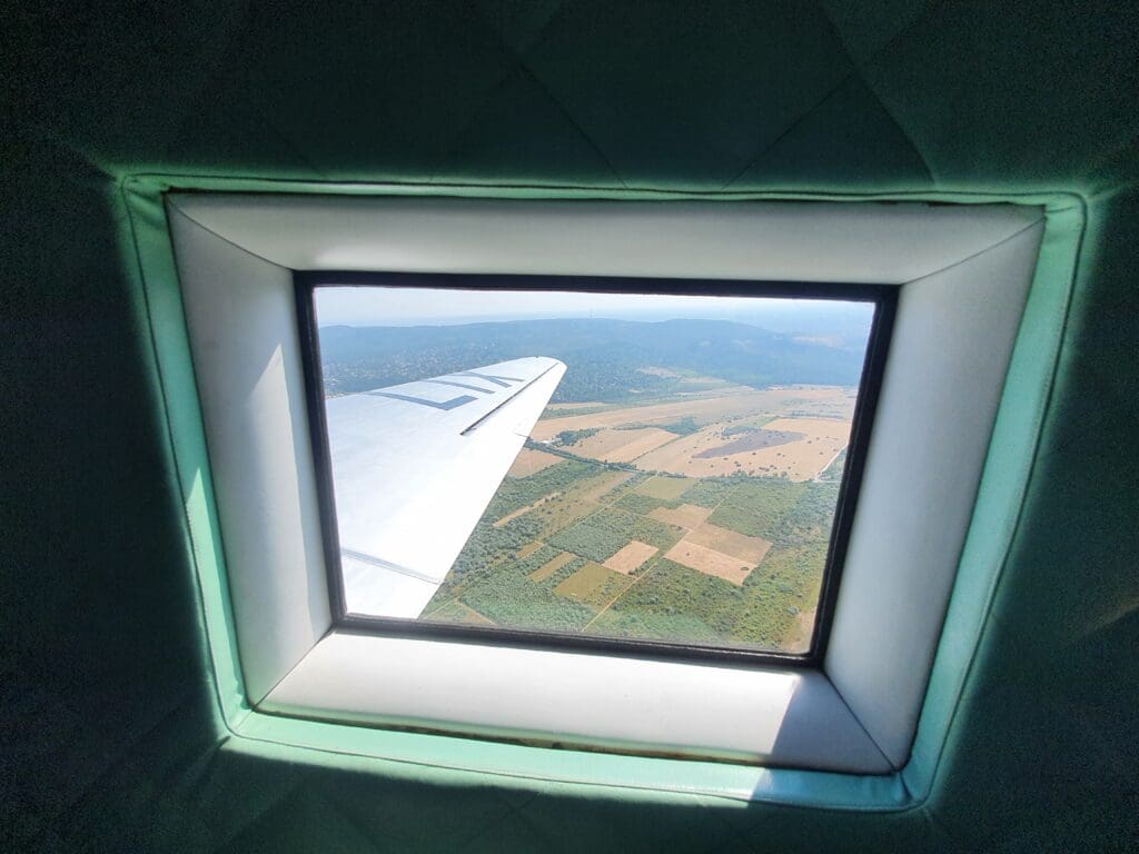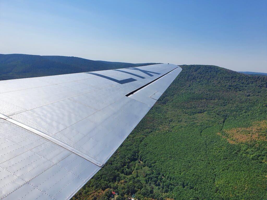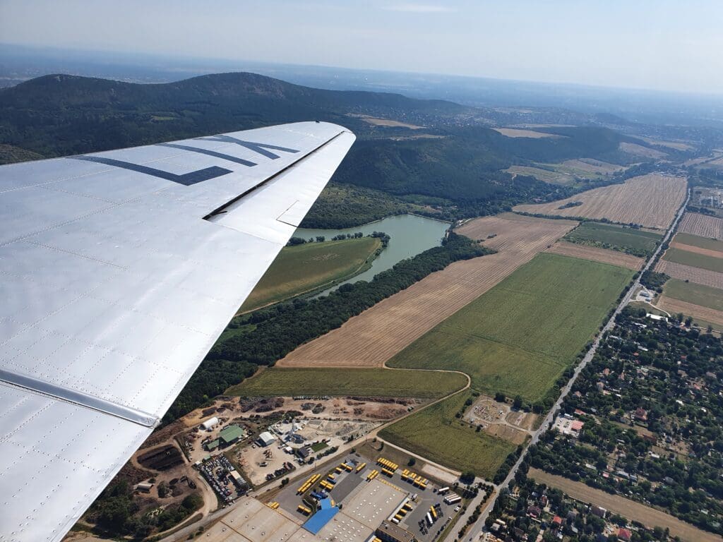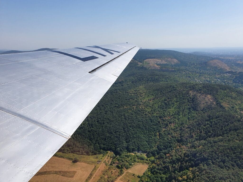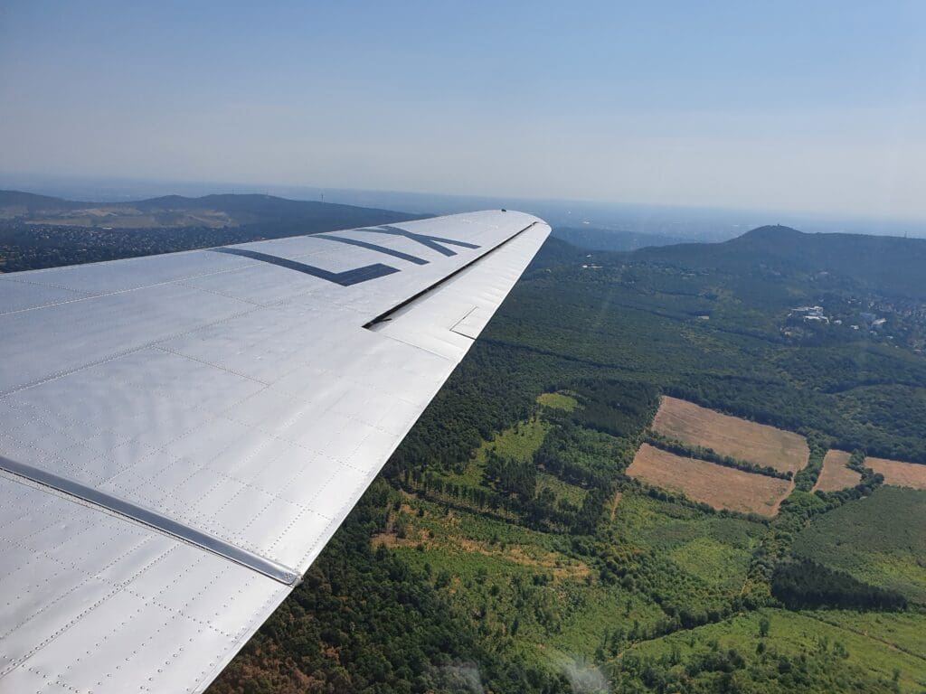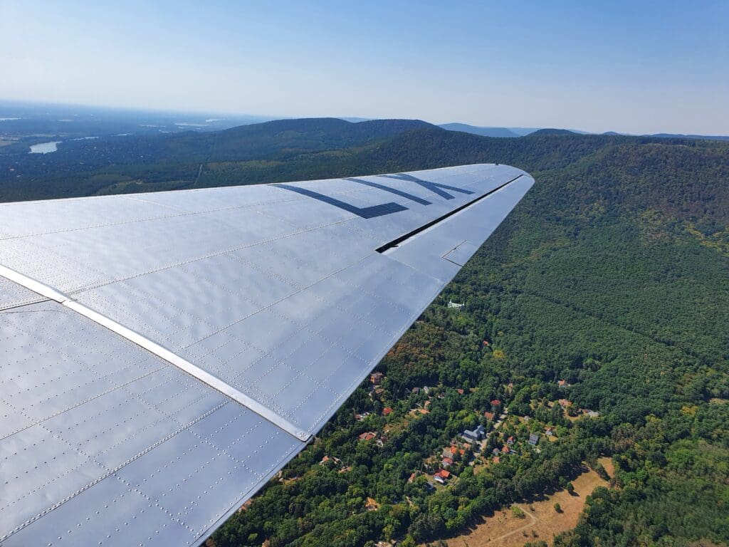 Once the Lisunov was safely in the skies, the flight attendant stood up and continued their speech. As was to be expected given the demographics of the flight, as with the pre-flight speech, this was performed in Hungarian only although I assume this had something to do with the history of the aircraft and our route that morning. Heading northwards after departure, the aircraft passed over the Hungarian capital’s suburban fringes near the city’s border with Pest County before the scenery below changed to fields, hills and forests as we journeyed over the Duna-Ipoly National Park. Below, the wooded hillsides of the national park passed by just a short distance below the aircraft whilst I managed to spot a Scheibe SF-25 motor glider not too far away, perhaps making good use of the plentiful thermals on this very hot summer’s day. However, these thermals did mean that the Lisunov bounced around for much of the flight, leading a fellow passenger in the rear row to let out an occasional gasp.