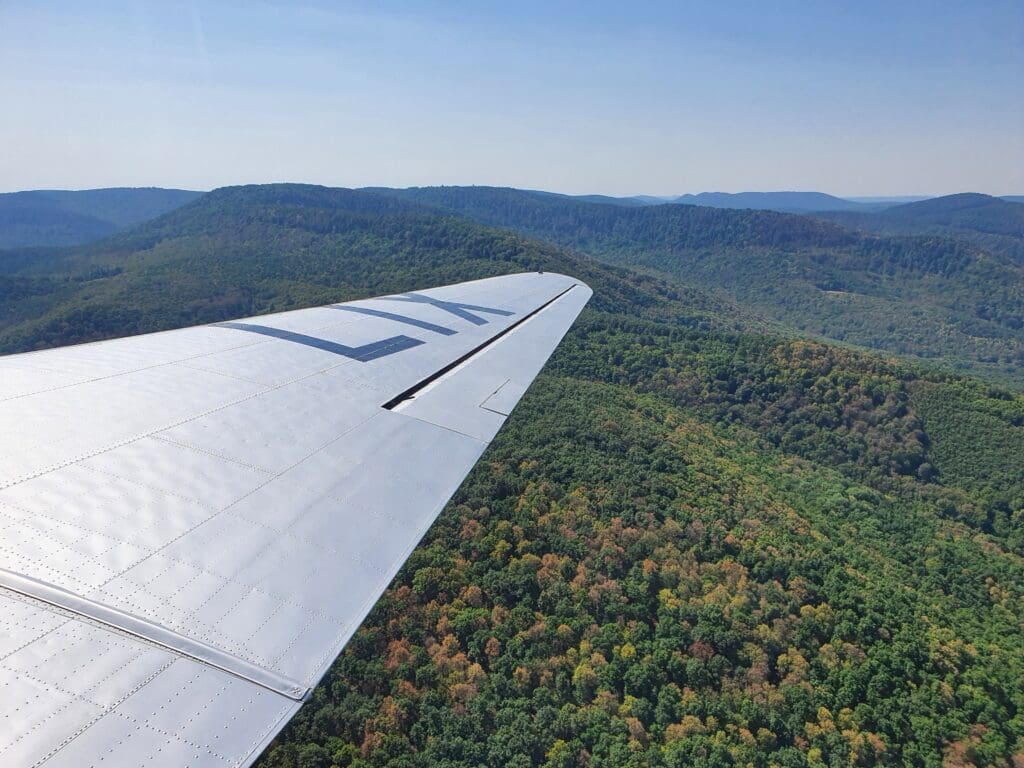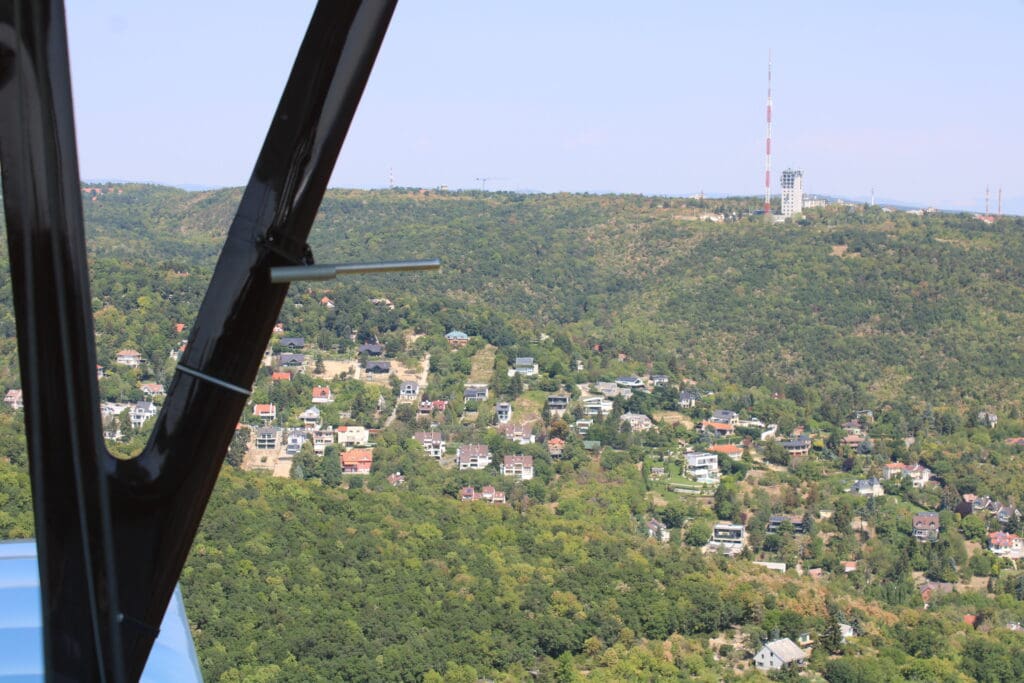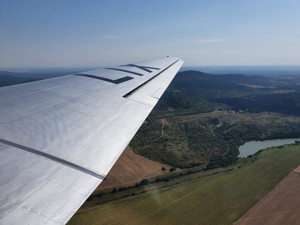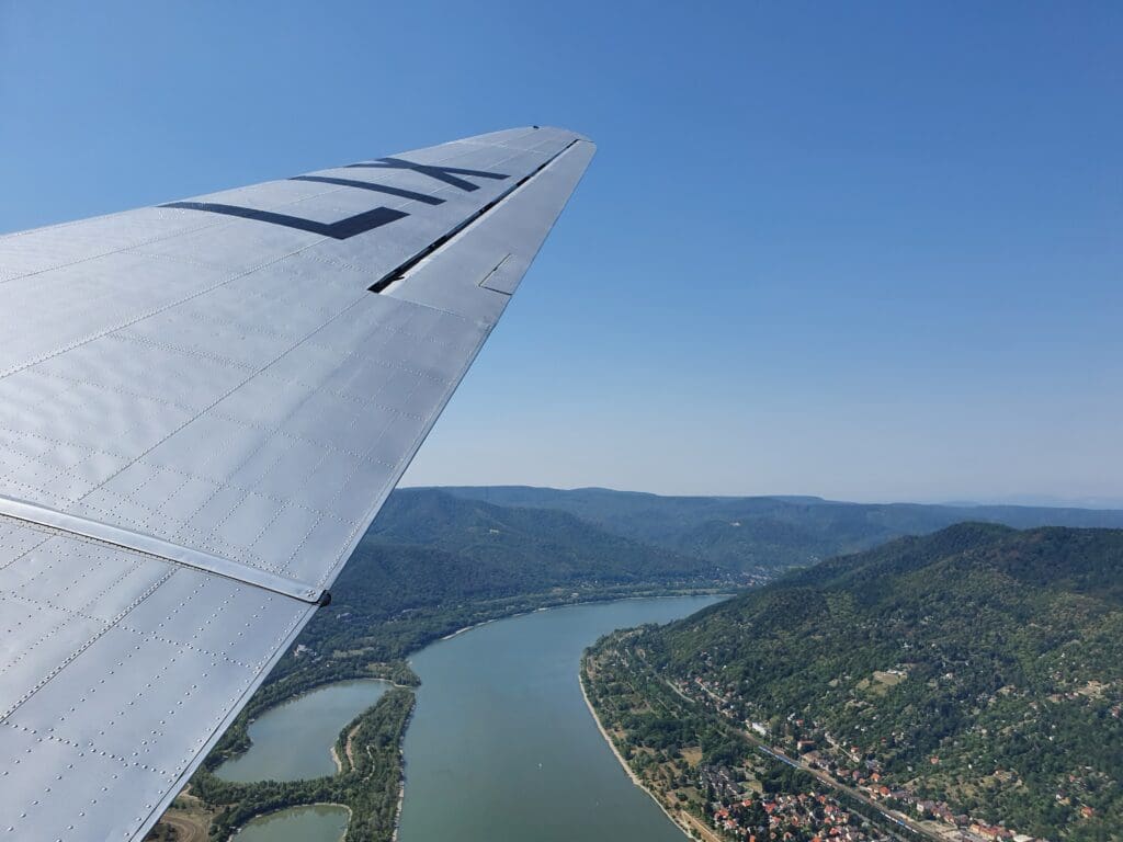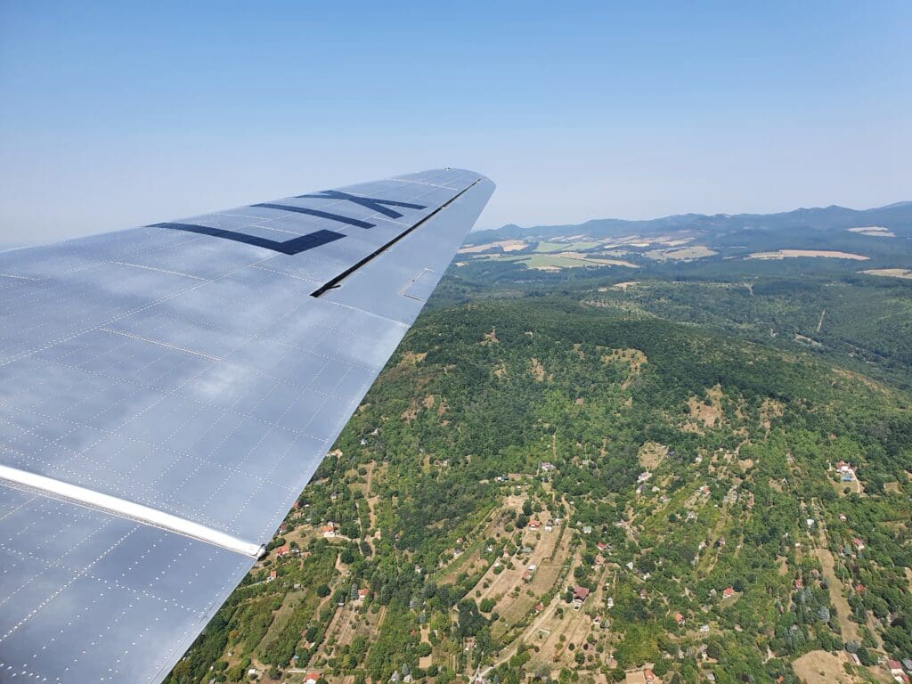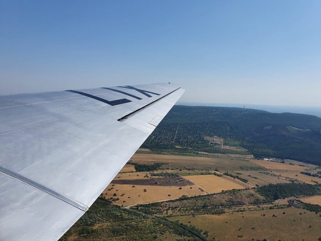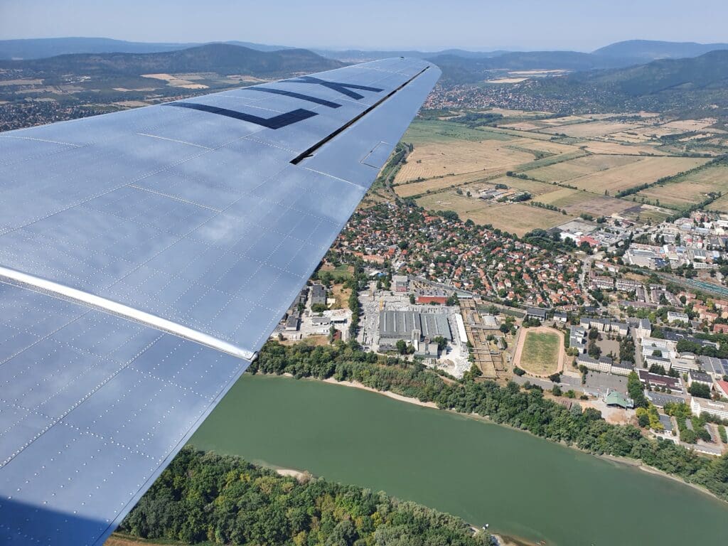 Once the Lisunov was safely in the skies, the flight attendant stood up and continued their speech. As was to be expected given the demographics of the flight, as with the pre-flight speech, this was performed in Hungarian only although I assume this had something to do with the history of the aircraft and our route that morning. Heading northwards after departure, the aircraft passed over the Hungarian capital’s suburban fringes near the city’s border with Pest County before the scenery below changed to fields, hills and forests as we journeyed over the Duna-Ipoly National Park. Below, the wooded hillsides of the national park passed by just a short distance below the aircraft whilst I managed to spot a Scheibe SF-25 motor glider not too far away, perhaps making good use of the plentiful thermals on this very hot summer’s day. However, these thermals did mean that the Lisunov bounced around for much of the flight, leading a fellow passenger in the rear row to let out an occasional gasp.