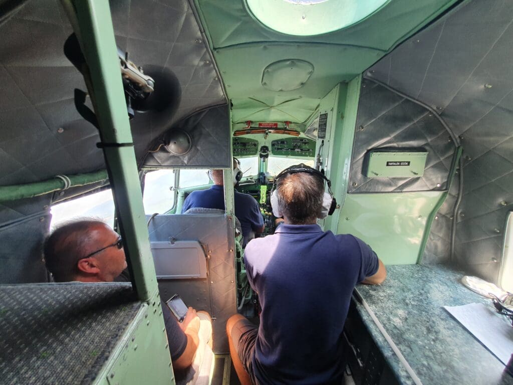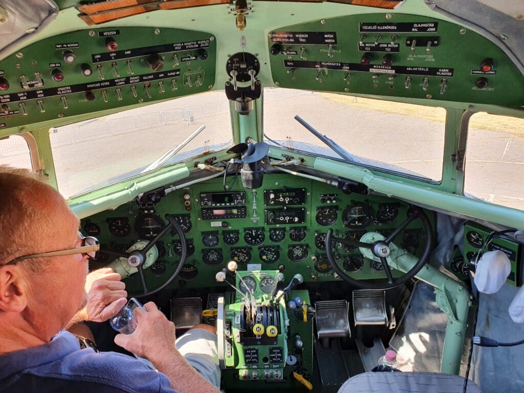 Despite the turbulence, once the flight attendant had concluded their speech, one-by-one passengers were invited to head up to the cockpit, starting with those at the rear of the aircraft. At this time, noticing that I was not Hungarian as they had first thought, the flight attendant very kindly offered to give a summary of their speech in English and asked me if I had any questions about the aircraft. Whilst this was not required, we did have a quick chat about both the Douglas DC-3 and the Lisunov Li-2, and it was clear that the flight attendant was passionate and enthusiastic about their work. Unable to pass on the rare opportunity to head up to the flight deck during a flight, I soon cautiously headed up through the cabin before reaching what could perhaps be described as the avionics bay which sits between the cabin and the cockpit. Proceeding through this, that morning there was a full house in the cockpit, with all four stations there taken. After observing the crew for a few moments whilst they went about their work, I retreated to the cabin just as the aircraft reached its most northerly point on the route where it banked around a castle before heading southwards towards Budapest – although unfortunately I was sat on the wrong side of the aircraft to see this.