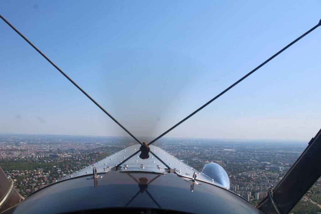 At around 0930, an army of volunteers donned in Goldtimer Foundation t-shirts and reflective jackets made their way out to the foundation’s fleet and began prepping each aircraft for a new day of flying, with this set to commence at 1000. As time passed, more and more passengers arrived with a crowd of excited passengers crowding around the Lisunov Li-2’s port wingtip before being led out for their 15 minute flight over Budapest. At almost 1000 on the dot, the two open cockpit aircraft that I would fly on later that morning, the replica Bánhidi Gerle and the Poliparkov Po-2 could be seen taking to the skies in formation before buzzing off into the distance. Meanwhile, once all passengers had been led out to the Lisunov, the cabin door was closed and a short time later its two piston engines fired up into life producing plenty of noise and streams of white smoke that took a while to dissipate.