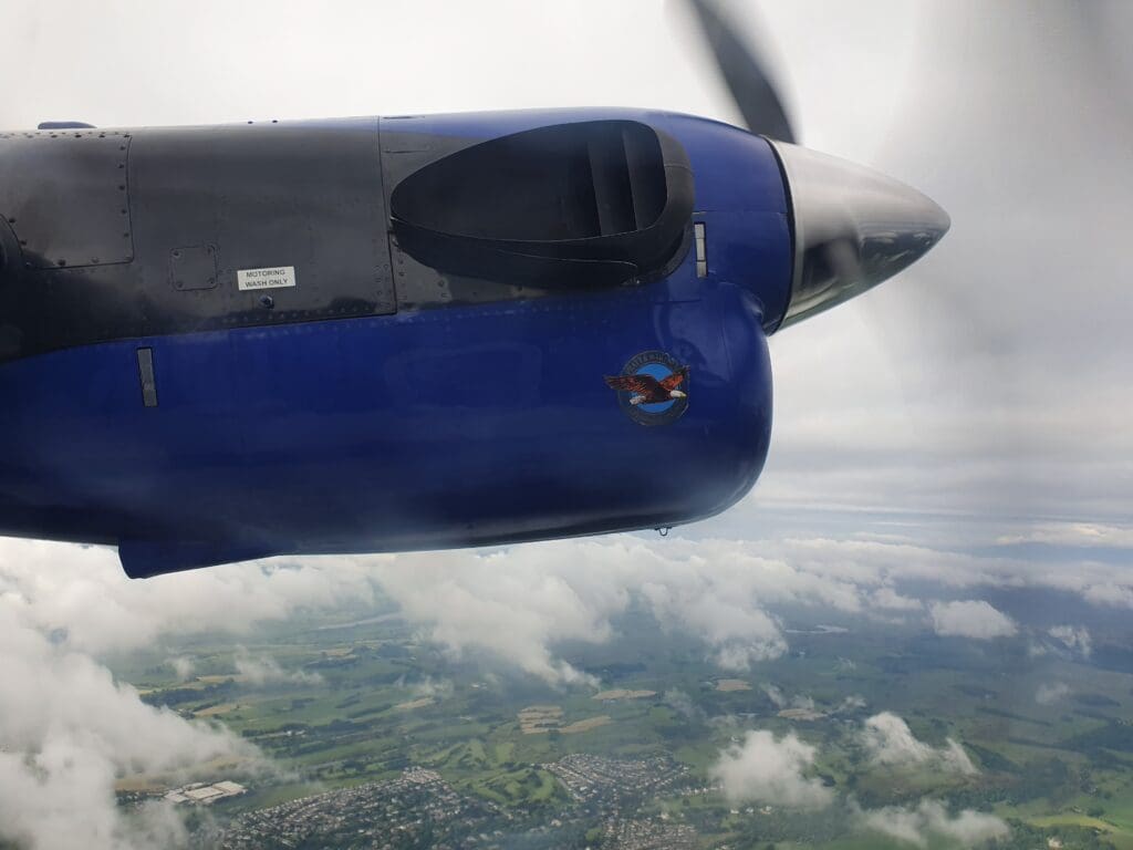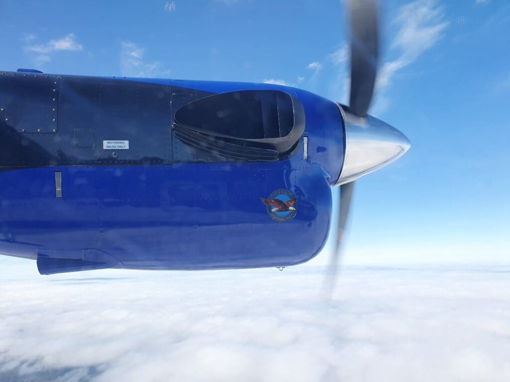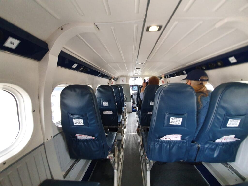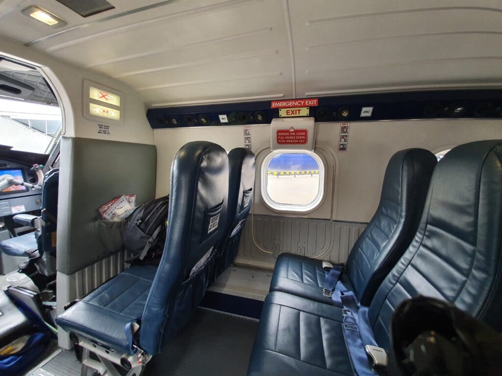 Once I had taken a few photos, I climbed up the aircraft’s sturdy built-in steps before bending over to avoid banging my head on the 1.42 metre-high cabin door as I entered the Twin Otter’s small cabin. Onboard, a total of nineteen seats could be found with all rows bar the rearmost featuring three seats in a 1-2 configuration. Each of these is covered in dark blue (faux?) leather and appears to be relatively thin however upon sitting down I was pleased to find these to be fairly comfortable and offer a decent amount of legroom for such a small aircraft. Much to my delight, aside from offering a good view of the cockpit, I was pleased to find that my seat aligned perfectly with the window, allowing for a good view of the world outside and one of the aircraft’s two powerful Pratt and Whitney PT6A-34 turboprop engines. As is the norm on the Twin Otter, none of the aircraft’s nineteen seats features a tray table, meanwhile, the seatback pockets contain a safety card and a plain white sickbag. Finally, seeing as the aircraft had only just emerged from maintenance, I was hardly surprised to find this to be in a clean state. However, a fair number of marks and scratches could be seen dotted about my seat area – although this was to be somewhat expected given the nature of the Twin Otter as a rugged utility aircraft and not a conventional airliner.