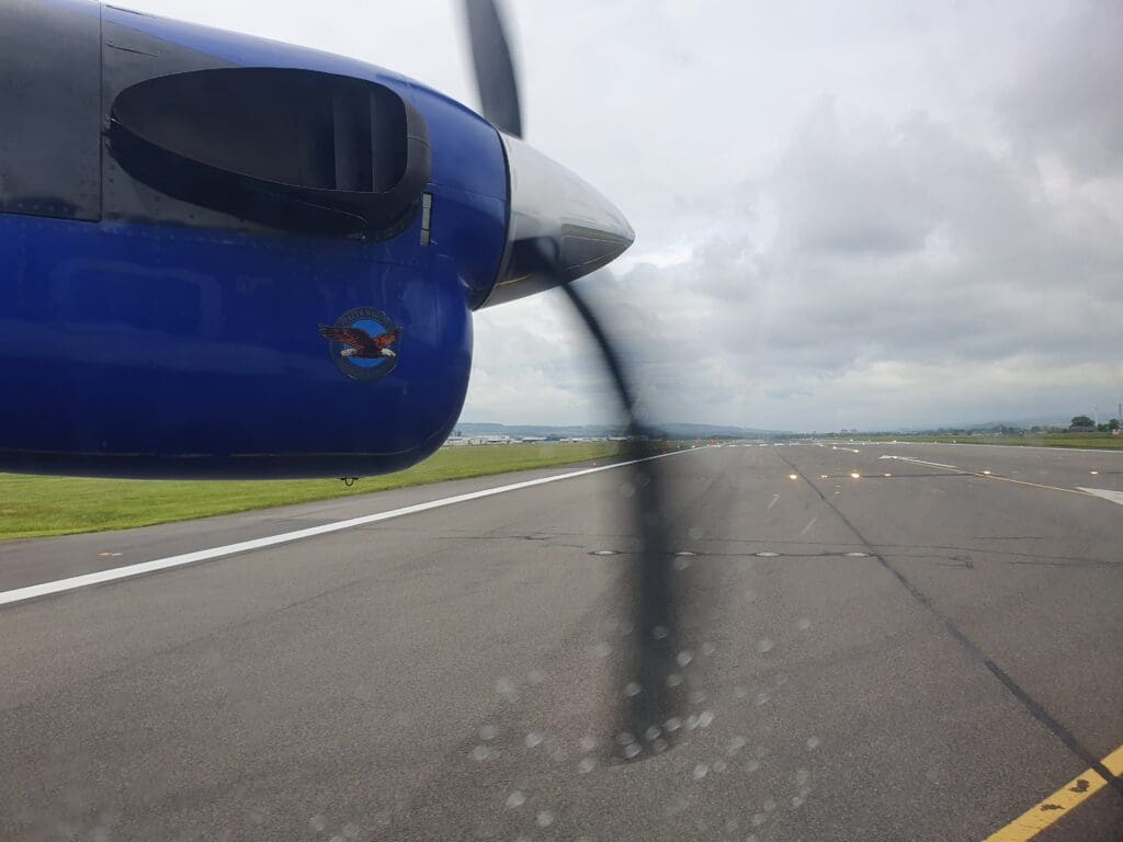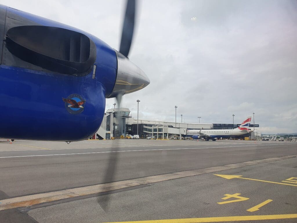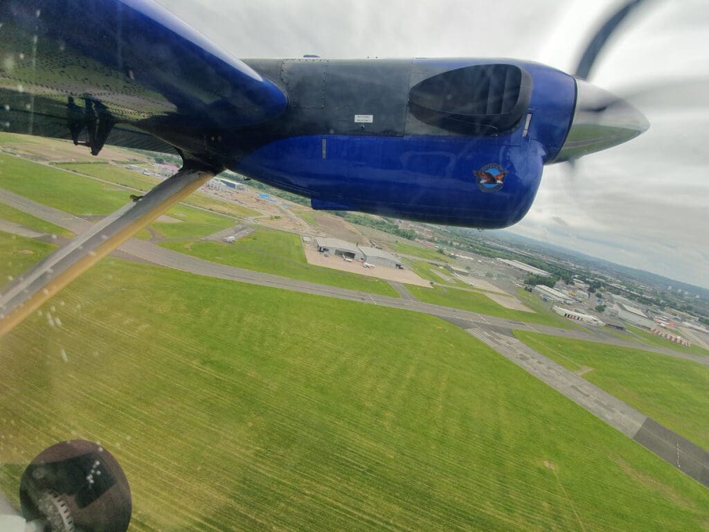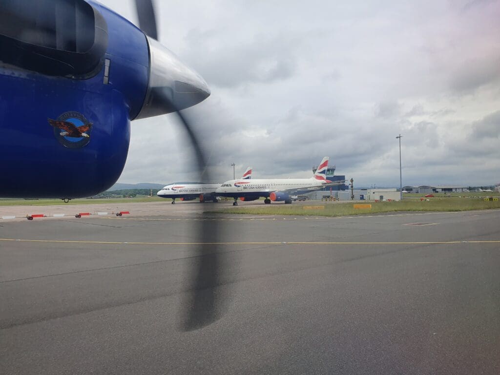 Following another short pause, the aircraft headed away from the ramp and turned right before traversing down Taxiway Alpha as the Twin Otter made what seemed to be a squeaky taxi. Sitting on the left-hand side of the aircraft, during this journey little could be seen except a trio of stored British Airways Airbuses and the picturesque green hills in the distance. Meanwhile, those on the opposite side were treated to views of the airport’s general aviation area and the smorgasbord of Air Charter Scotland and Gama Aviation aircraft waiting for their next sorties. No more than a couple of minutes after leaving its stand, the Twin Otter arrived at the holding point, and with no other traffic, our departure seemed imminent. However, once there the aircraft paused for some time and ‘revved up’ its two engines three times – causing even more noise and vibration, and giving passengers a taste of what was to come.