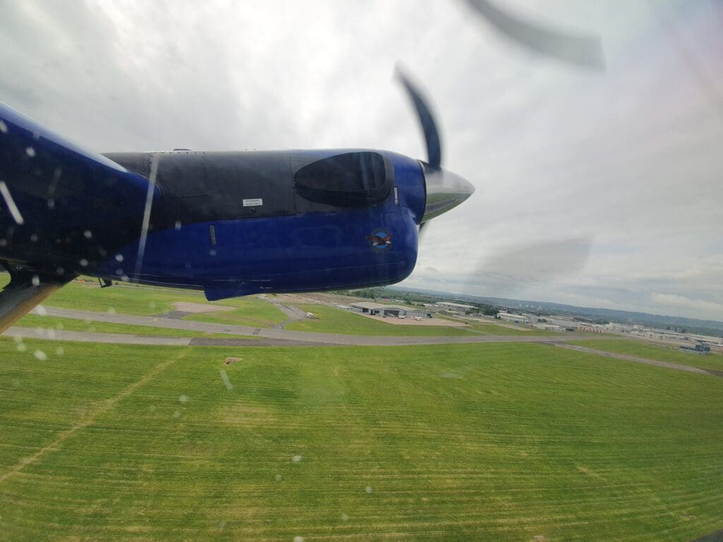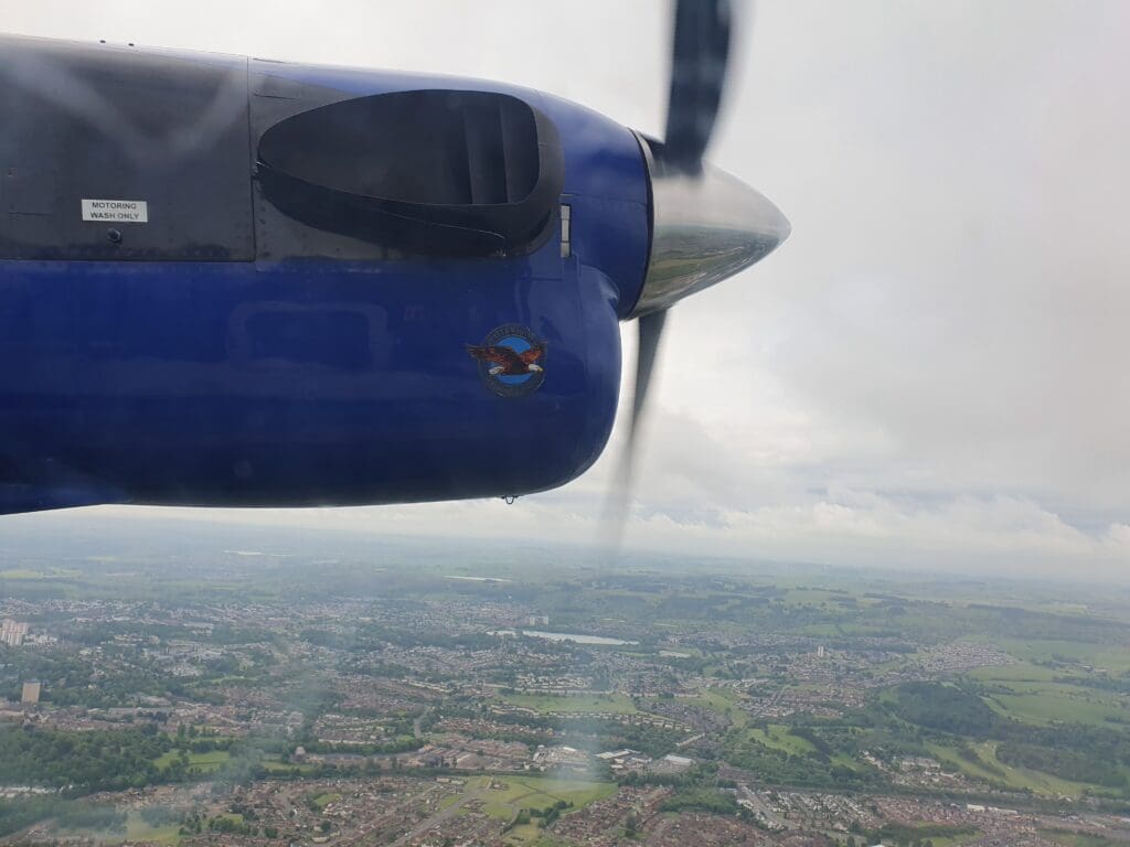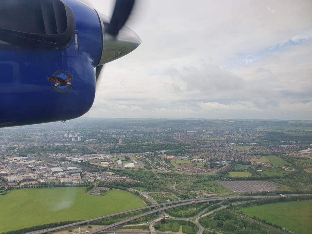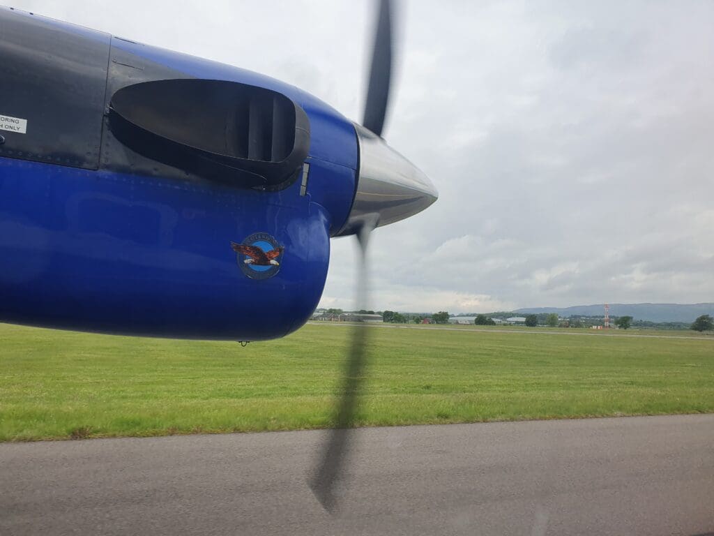 Following another short pause, the aircraft headed away from the ramp and turned right before traversing down Taxiway Alpha as the Twin Otter made what seemed to be a squeaky taxi. Sitting on the left-hand side of the aircraft, during this journey little could be seen except a trio of stored British Airways Airbuses and the picturesque green hills in the distance. Meanwhile, those on the opposite side were treated to views of the airport’s general aviation area and the smorgasbord of Air Charter Scotland and Gama Aviation aircraft waiting for their next sorties. No more than a couple of minutes after leaving its stand, the Twin Otter arrived at the holding point, and with no other traffic, our departure seemed imminent. However, once there the aircraft paused for some time and ‘revved up’ its two engines three times – causing even more noise and vibration, and giving passengers a taste of what was to come.