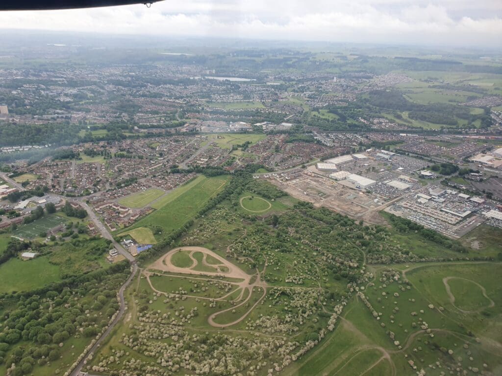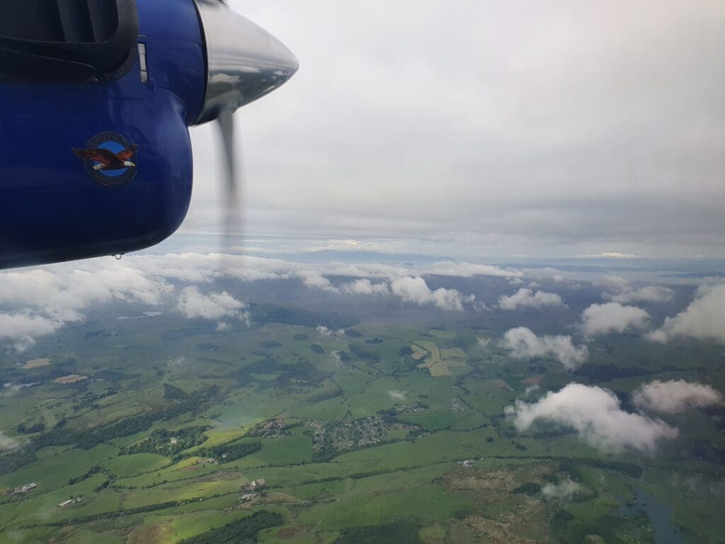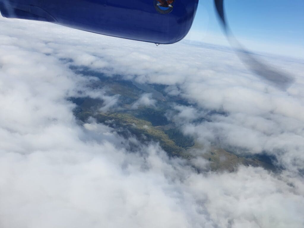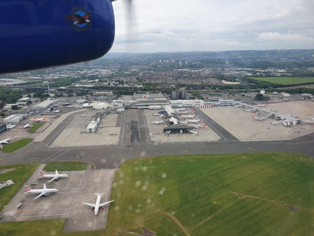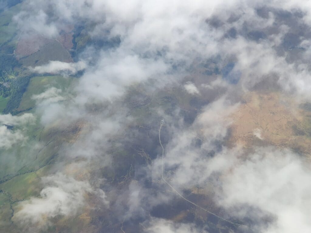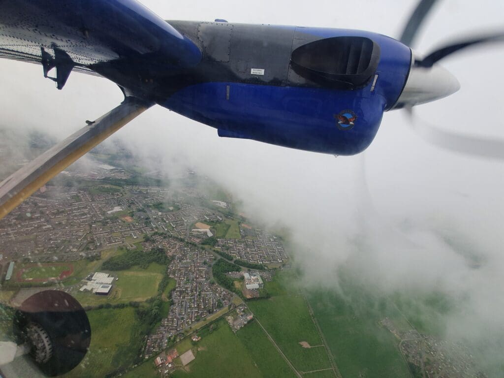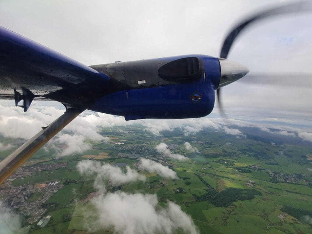 At 0904, the Twin Otter finally positioned itself onto the runway and the aircraft’s two engines were spooled up once again as the brakes were held. Once these were released, the aircraft powered down the runway. Although this take-off roll was slightly more gentle than I had expected, given the Twin Otter’s status as a STOL aircraft, the aircraft floated off the runway in a matter of seconds and I was offered a fantastic bird’s eye view of the airport during the first few moments of the flight. As the aircraft climbed upwards and left the airport behind, decent views could be had of the nearby town of Paisley as the aircraft banked to the right, placing it on a northwesterly course towards Loch Lomond and the Trossachs National Park. In good weather, this flight is known to offer superb views of some of Scotland’s most picturesque scenery. However, that morning the country was shrouded in cloud – with this seizing views of the ground below only two minutes after departure. However, during the initial stages of the flight patches of green appeared through breaks in the cloud before the aircraft headed up above the clouds for good.