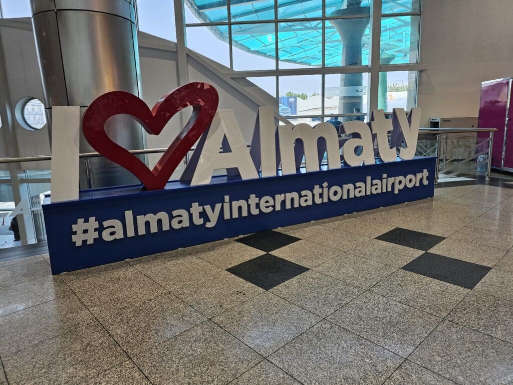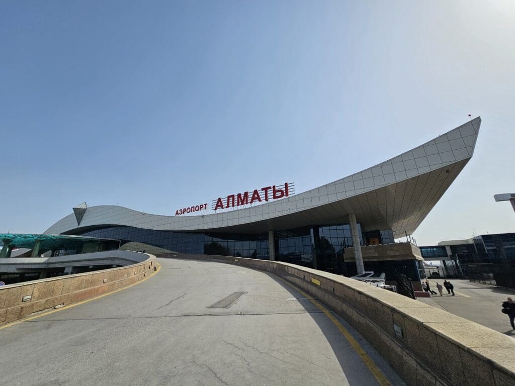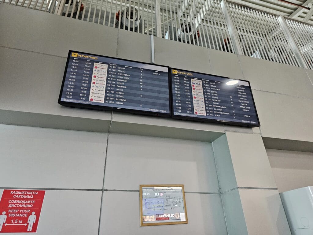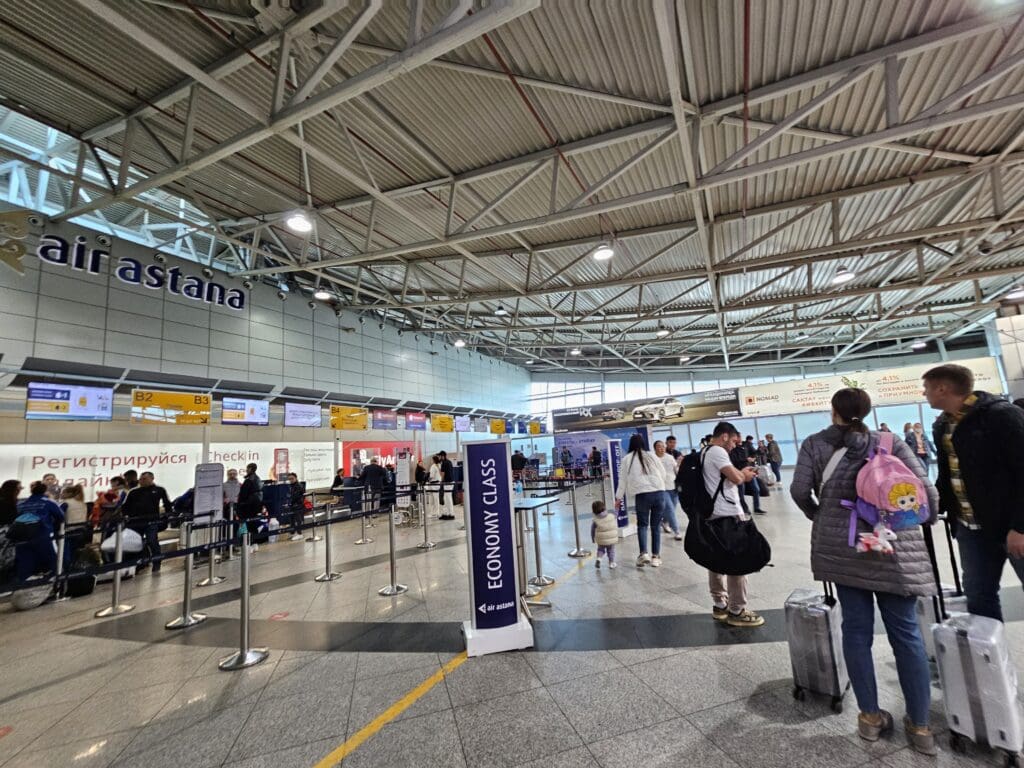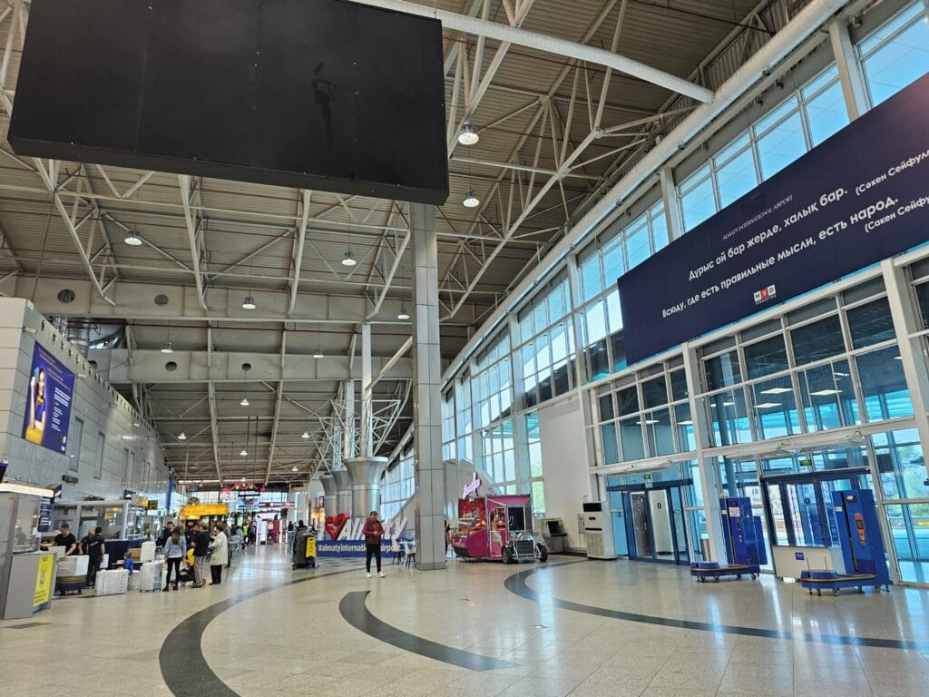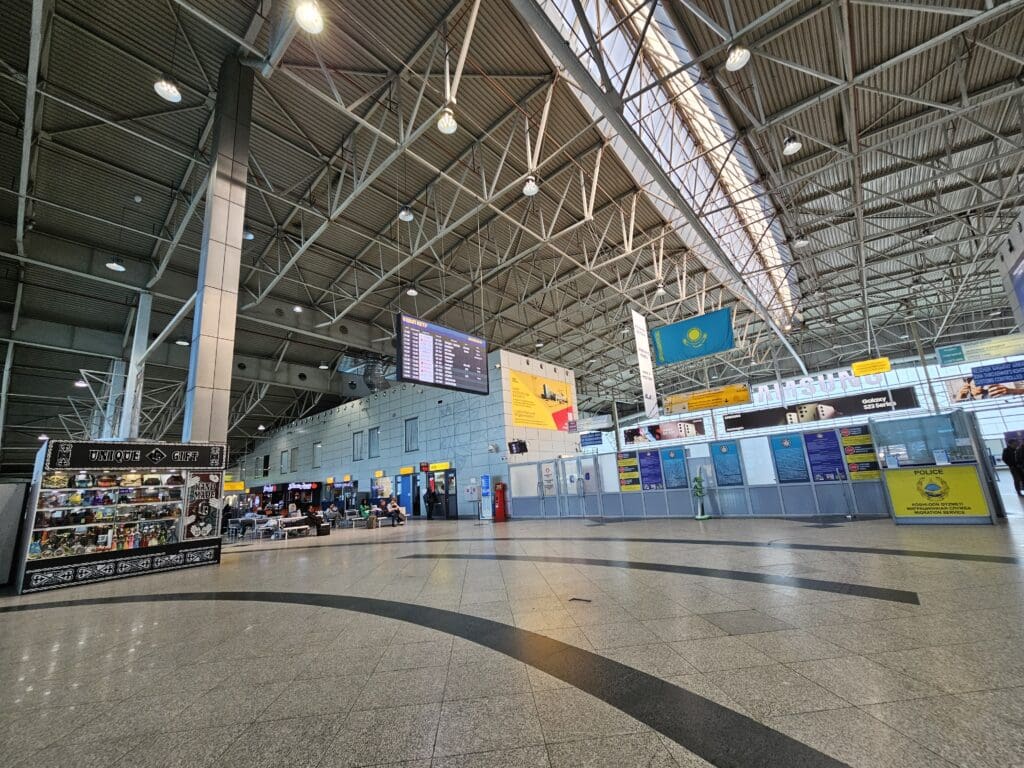 Following a short night of around four hours’ worth of sleep, I woke up at 0830, ready and raring to head to Kazakhstan’s capital city. After a quick shower, I dropped off my key and voyaged out onto the quiet backstreets of Almaty ready and raring to head off on a SCAT adventure. Being early May and following a cloudless night, that morning it was a little chilly although the lack of haze provided a superb view of the snow-capped Tian Shan Mountains in the distance. After passing several old Soviet-era apartment blocks, also known as khrushchevkas, around ten minutes after leaving the hotel, the airport’s somewhat distinctive terminal building appeared as I entered the home stretch. Following the sparkling diamond on top of the terminal building, I headed up the ramp and entered the terminal’s first-floor departure level. Since my last trip through the airport, the security check at the door has been removed and thus I was able to wander straight into the terminal without any sort of hassle.