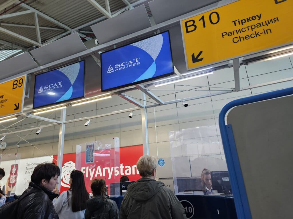 Even though Almaty is no longer Kazakhstan’s capital, it remains home to the country’s busiest airport. However, despite this, the landside portion of the terminal is by no means large. It does however feature a decent number of facilities including five cafés and multiple shops. Once inside, I headed to a currency exchange counter where I swapped my last Uzbek Som for Kazakh Tenge before heading to the local branch of Gloria Jean’s Coffee for, you guessed it, a coffee. In terms of its layout, Almaty Airport features two check-in halls which are located at opposite ends of the landside departures area – one for international services and another slightly smaller hall for domestic flights. Having arrived in good time for my flight, I was in no particular rush and after polishing off my cappuccino I strolled over to the domestic check-in hall. Once there, it became clear that Air Astana ruled the roost, with plenty of desks heavily decked out in the national carrier’s branding, whilst comparatively few desks had been assigned to Kazakhstan’s second airline, SCAT Airlines.