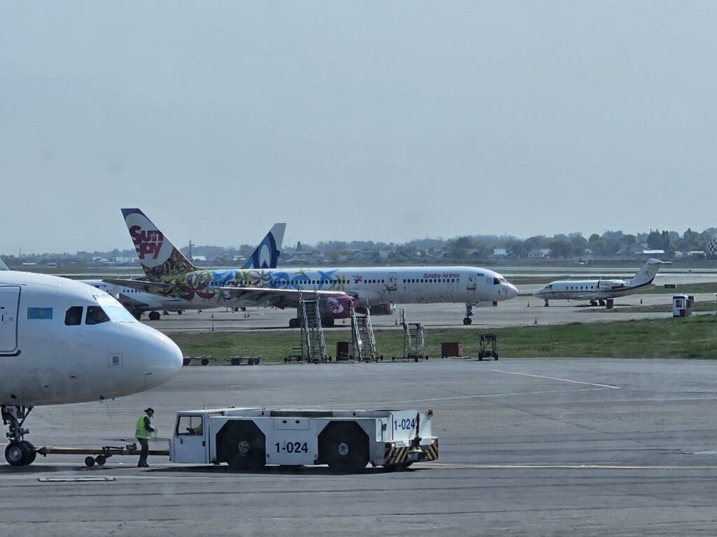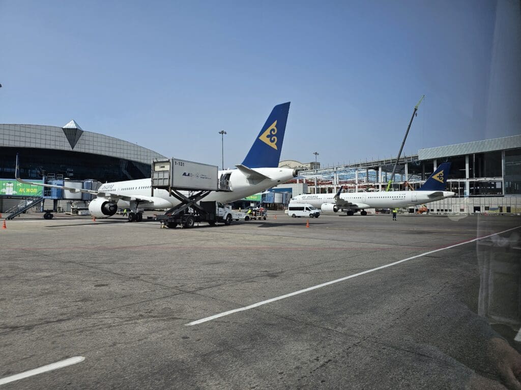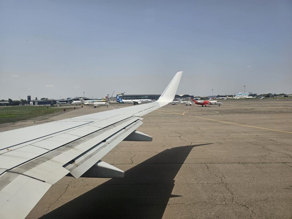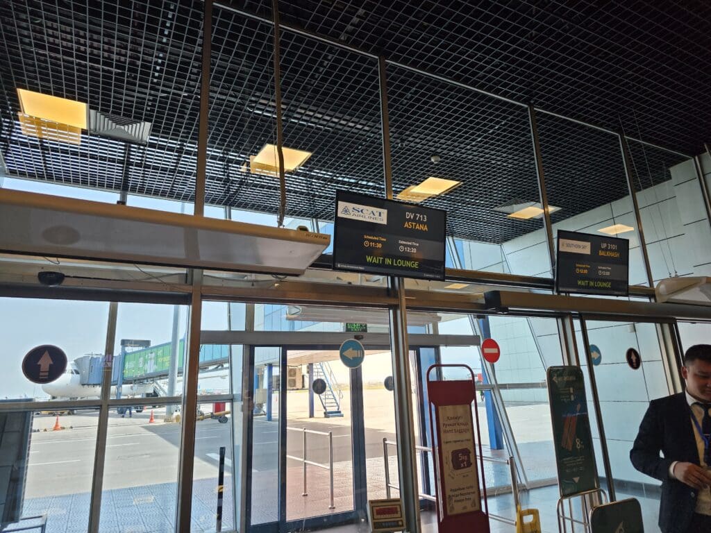 With some time on my hands, I decided to have a walk around the domestic portion of the terminal. Whilst not the largest of spaces to wait, I was pleased to find that both did not seem to be particularly crowded, even though there would be a total of eight domestic departures before my flight’s new departure time. With this being my first visit to this part of the airport in almost six years, I was pleased to find that this had been updated and appeared to be clean, tidy and relatively modern. For those looking for refreshments, plenty of cafés could be seen as well as a good number of shops selling a range of goods. Turning to the negatives, compared to some other terminals worldwide, airside views were limited, although the ‘no photography’ signs in place during my last visit had since been removed. Furthermore, the official WiFi network required text verification which, as in Uzbekistan, did not work without a local number. However, I was able to get around this by connecting to Stabucks’ complimentary network. Fully explored, I decided to head to the ground floor waiting area in case by some miracle boarding was announced on time. Plonking myself down near one of the windows, I gazed out at the sea of mostly Air Astana and SCAT Airlines that could be seen outside.