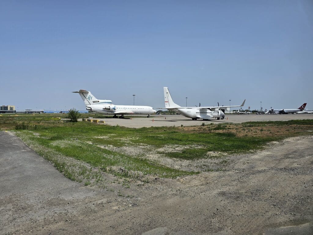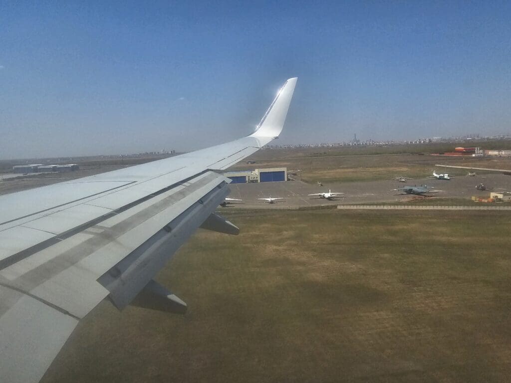 At 1359, all of a sudden, Astana’s suburbs rose out of the steppe and were followed a short time later by the famous sights of the city centre. As we trundled towards the airport I caught a fleeting glimpse of the Presidential Palace, Baiterek Tower and the top of the Khan Shatyr Entertainment Center in the distance as the landing gear fell into position in preparation for our arrival. A couple of minutes later, the Boeing sank over the perimeter fence with some slight swaying as if to indicate that there was a crosswind blowing at which point a cluster of diverse and interesting types operating for the government and military could be seen well away from the main terminal building. These included the Antonov An-12, An-26, An-74, the Let L-410 and a selection of Mil helicopters. This was then followed by the sight of a SCAT Airlines Boeing 737-300 holding short of the runway and a more modern Air Astana Embraer E2.