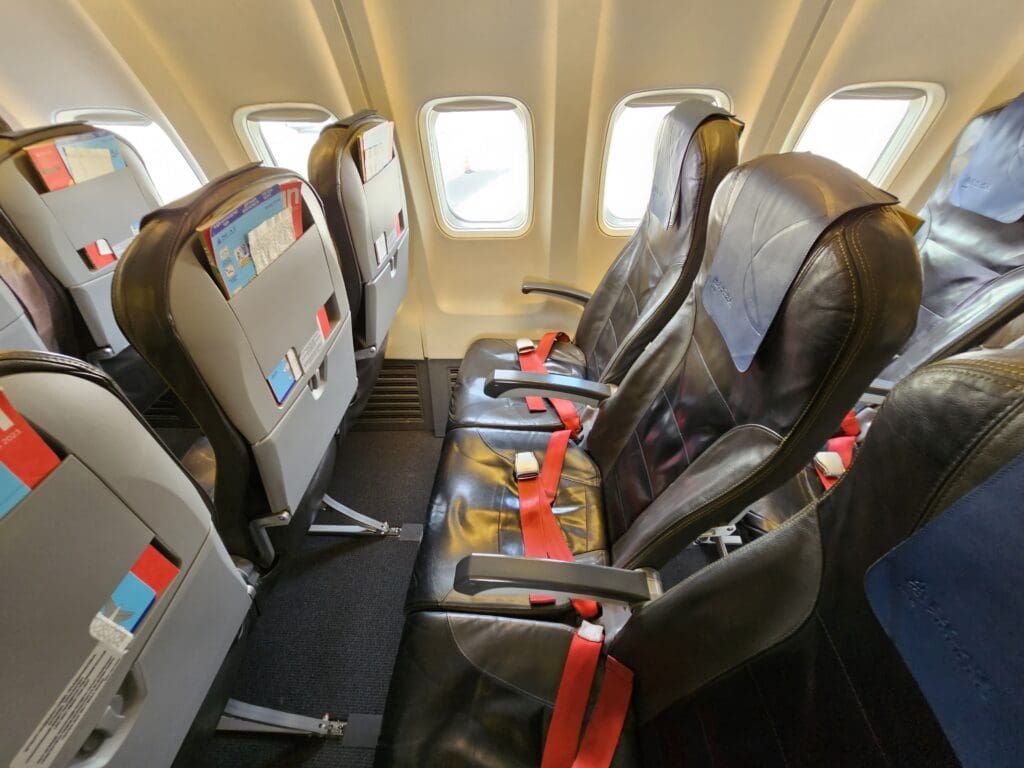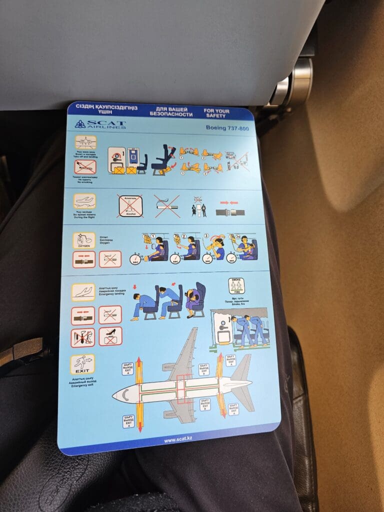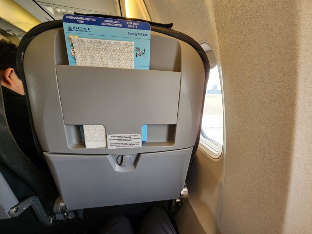 As soon as the doors of the bus slid open, passengers spilt out onto the apron and into the warm morning sunshine. There, plenty of jostling occurred as passengers appeared to be in a rush to get on board and head to Astana. Unlike most, I was in no particular hurry and snapped several photos of the jet before heading up the airstairs and stepping into the Boeing’s forward galley. As soon as I did so, I was welcomed in Russian by one of the flight attendants dressed in SCAT Airlines’ new distinctive turquoise uniform before I turned right and entered the cabin. Onboard, SCAT Airlines’ jets do not feature any sort of Business class product and, whilst not officially a low-cost airline, this particular aircraft was fitted with an LCC-standard 189 seats. Except for the removal of Turkish signage and the addition of leather antimacassars on which SCAT Airlines’ could be seen debossed, I may as well have been on a Pegasus jet. This aircraft featured Pegasus’ interior with low-cost thin pleather seats with yellow stitching and red seatbelt straps in line with the Turkish airline’s branding. Each seat featured a literature compartment complete with the April 2023 copy of SCAT Airlines’ Aspan magazine, a sick bag adorned with the carrier’s motif and a safety card.