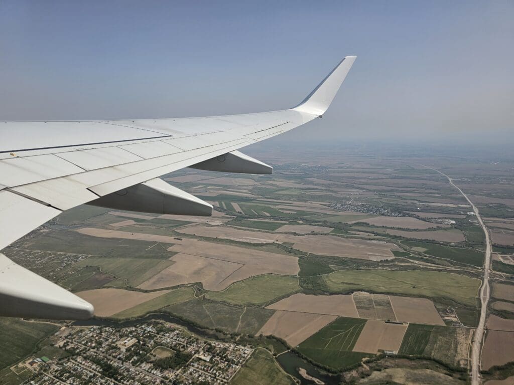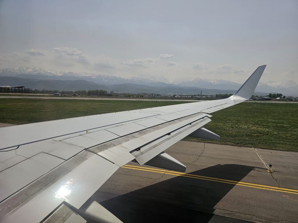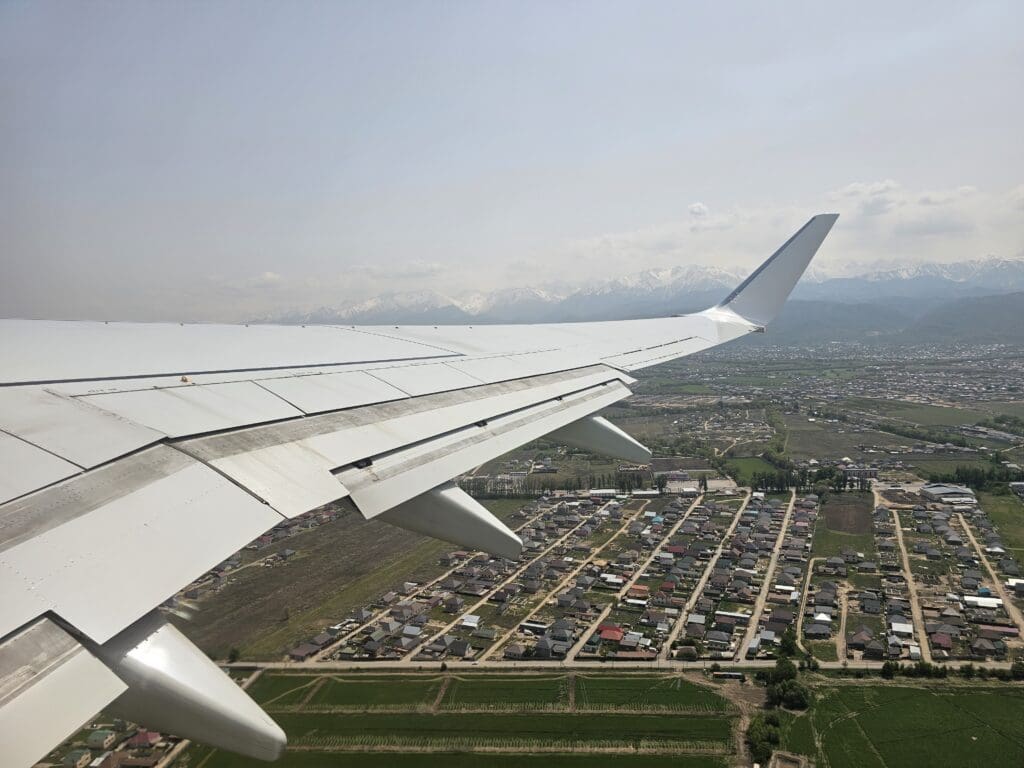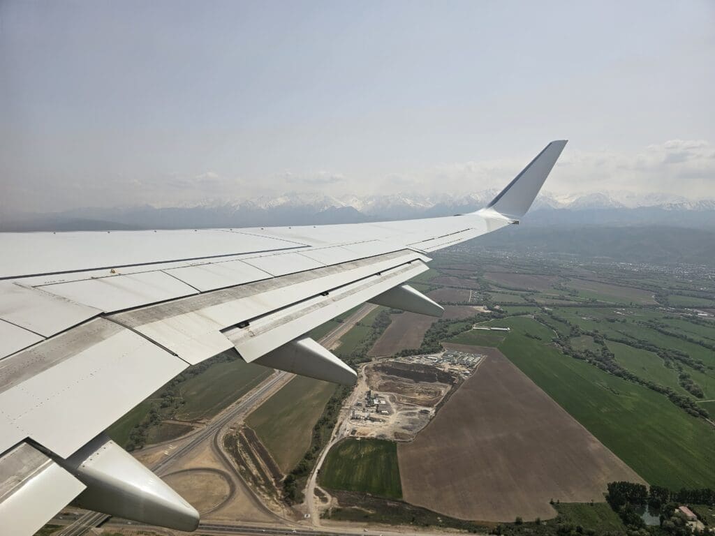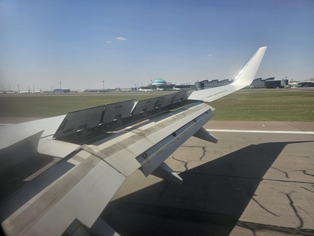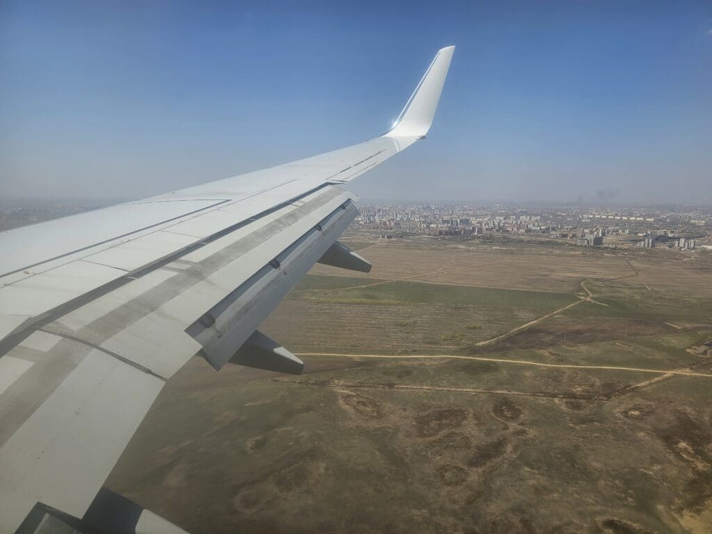 Upon arriving at the runway, the Boeing came to a halt just as a FlyArystan Airbus A320 could be seen undertaking a go-around. Once this passed overhead, the Boeing made its way onto the runway and came to a halt for around a minute. At 1237, the two engines powered up and the aircraft performed a powerful takeoff roll, soon rocketing upwards into the skies. Whilst slightly hazy, a good view of the picturesque Tian Shan Mountains could be had as we climbed over the fields and towns that sit just to the east of the airport before the aircraft banked onto a northerly heading that would take us to Astana with no further turns until on final approach.