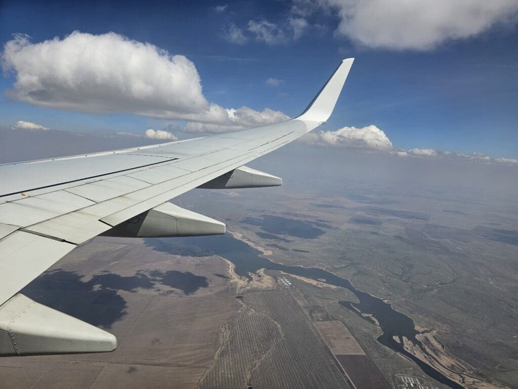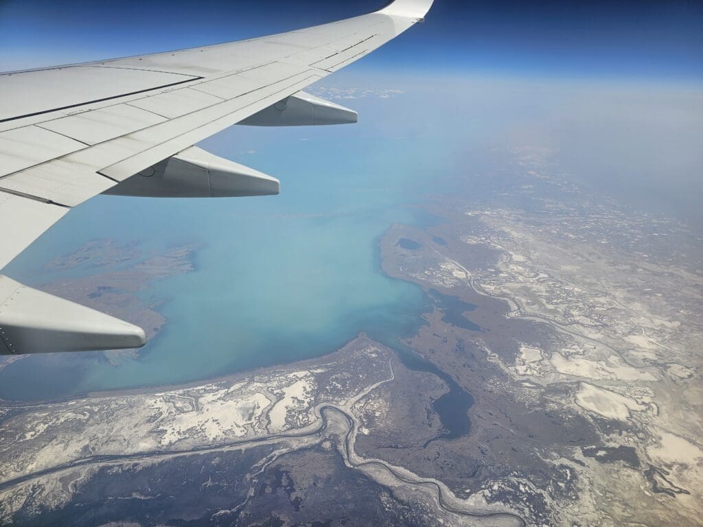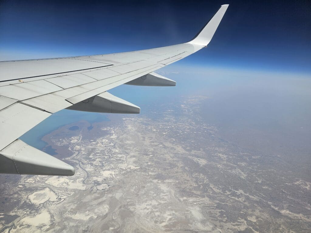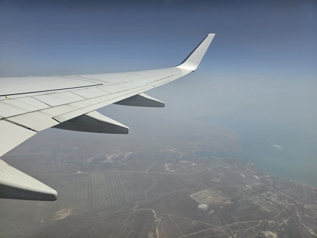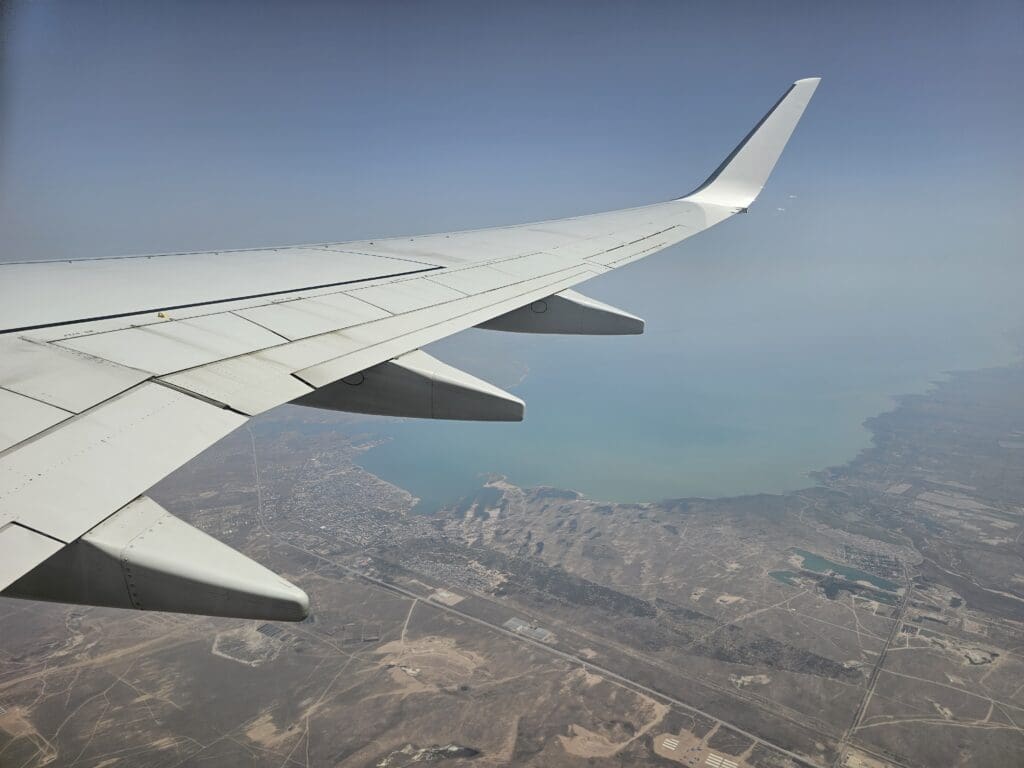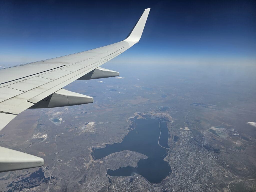 Looking outside, it wasn’t long before the green landscapes around Almaty became much arider and sandier looking and soon I caught soon caught sight of the airbase at Zhetygen. This is home to the old Antonov An-26 as well as the comparatively new Casa 295M, plus a fleet of Mil Mi-17V-5 helicopters. This was then followed by vistas of the turquoise waters of the Kapchagay Reservoir and the town of Qonaev. After this, comparatively little could be seen other than the odd road and small village as we followed the Ile River northwards for some time before leaving this behind just before reaching our cruising altitude of 38,000 feet. As seems to be fairly common in this part of the world, despite our smooth departure and climb, the seatbelt signs remained firmly illuminated until we reached our cruising altitude. Once we had levelled off, these dinged off and the usual announcement regarding keeping these fastened whilst seated rang out through the cabin.