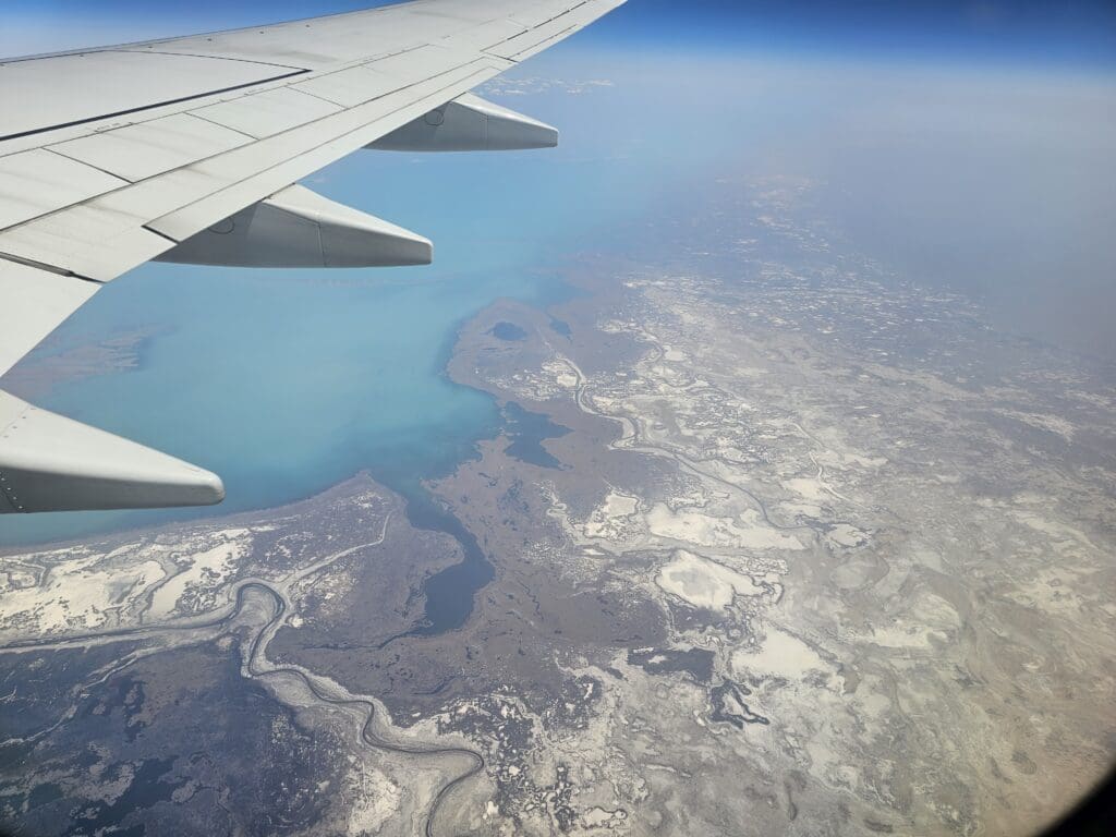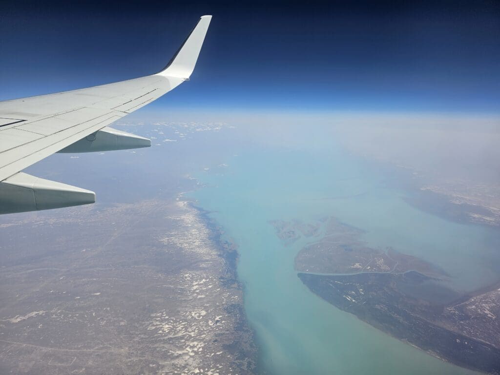 Turning my attention back outside, after leaving the Ile River behind I failed to spot a single sign of human life below as we cruised towards the fifteenth largest lake in the world, Lake Balkhash. As we neared this, the scenery below became rather impressive before we headed out over the lake’s turquoise waters and crossed from the Almaty Region to the Karaganda Region. Following our quick lake crossing, the Boeing arrived at the lake’s northern shores near the small city of Balkhash and continued heading northwards over the near-empty lunar-like landscape below.