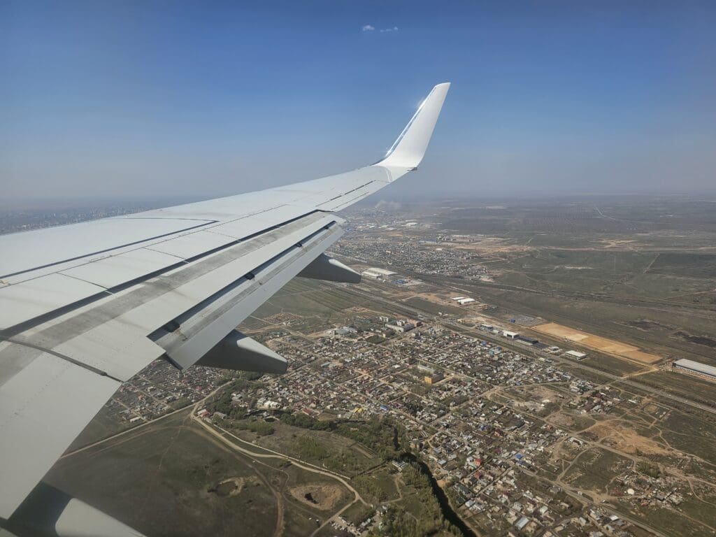 As we cruised north, the landscape became a little more rocky and hillier for a time roughly halfway between Balkhash and Karaganda, although once more, few signs of life could be seen below until we neared the city of Karaganda. Almost an hour into the flight, a ding rang out through the cabin as the seatbelt signs were reilluminated in preparation for our arrival into Astana. This was followed by a trilingual announcement with the usual pre-arrival instructions with the crew soon passing through the cabin in order to ensure that all was set and in place for our arrival. At this time, the aircraft passed just to the west of Karaganda Airport, although no aircraft could be seen on the ground there at that time. This was then followed by views of the apartment blocks to the east of the city’s centre