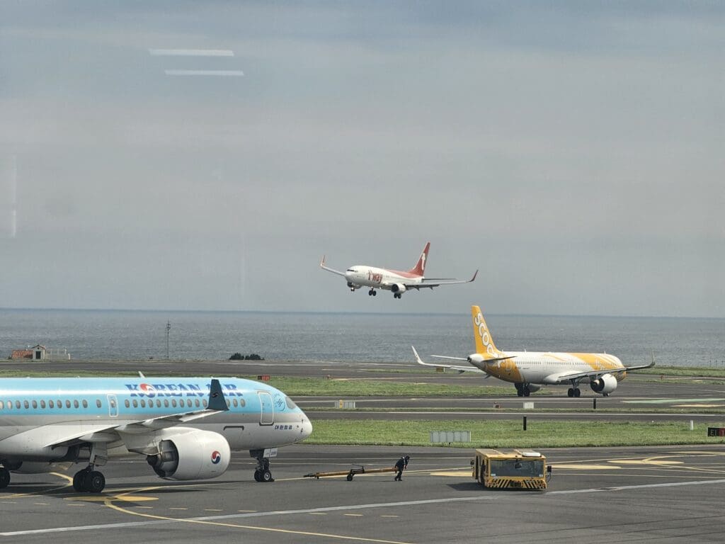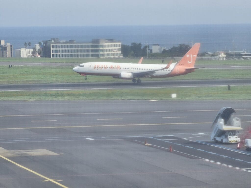 Alongside plenty of Korean airlines, as I waited I spotted two guests from abroad, a Scoot Airbus A321neo heading off at the start of its long five-hour slog down to Singapore, and a Tiger Air Taiwan Airbus A320 touching down at the end of its relatively short flight from Taipei Taoyuan. Meanwhile, as always seems to be a permanent fixture at Jeju, several Spring Airlines Airbus A320s could be seen on the ground waiting to head back to China. Looking at Flightradar24, I tracked the inbound Aero K Airbus as it made its way down from Cheongju. Following a 54-minute hop, I watched as the inbound aircraft floated down over the blue sea and made a slightly smoky touchdown on Runway 25 at its scheduled arrival time of 0925.