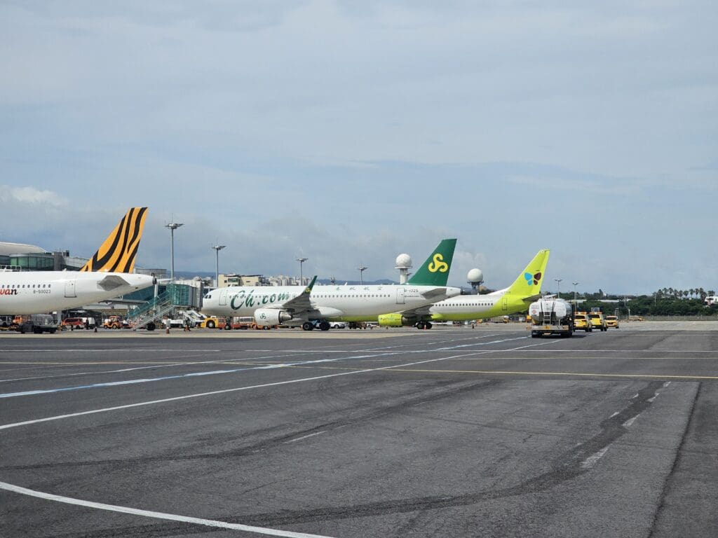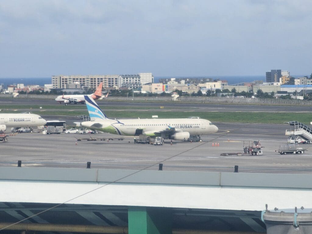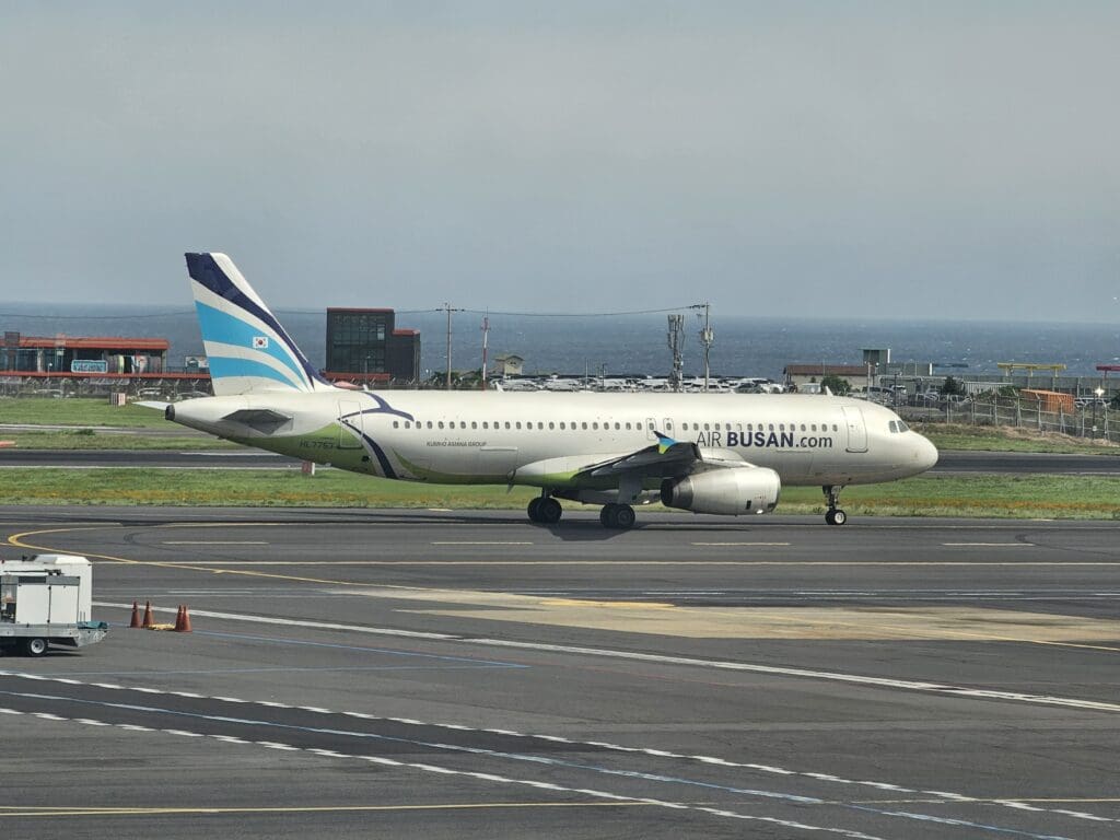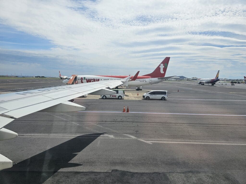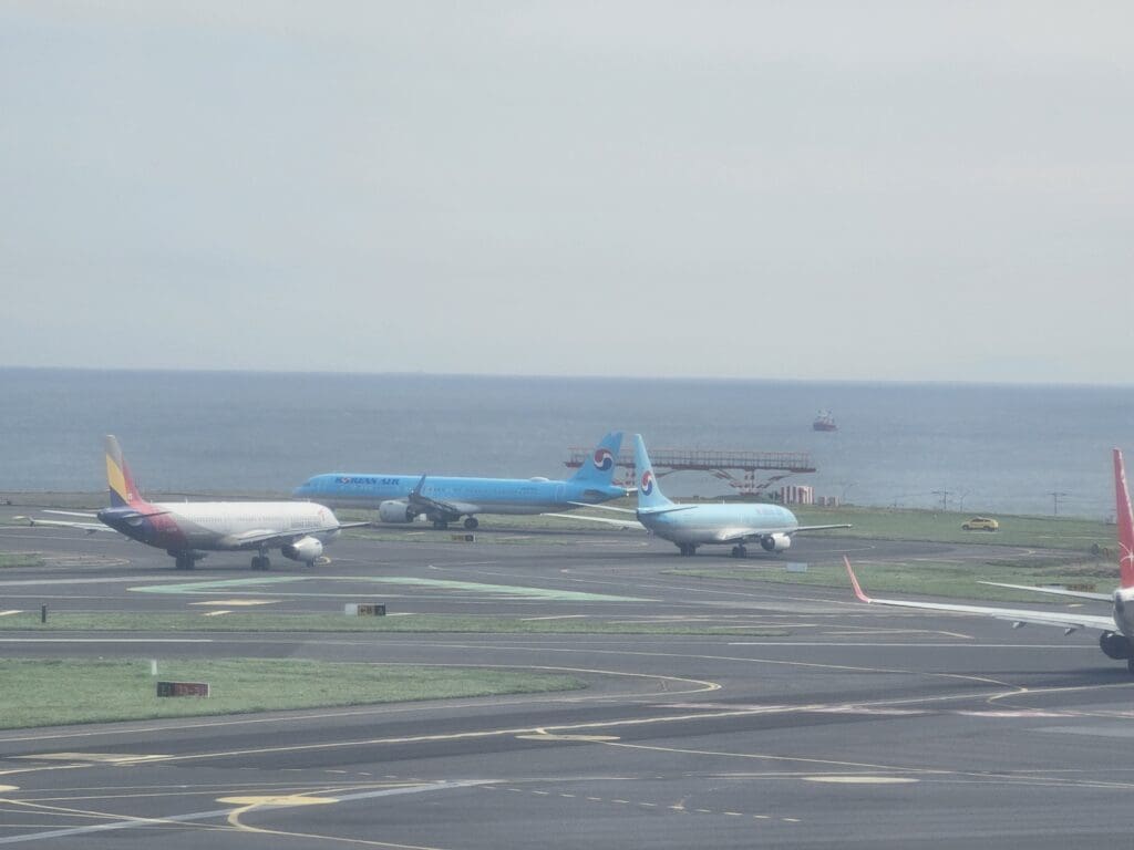 As we slowly edged forward, two members of the ground crew waved us goodbye before we swung left and began our taxi to the end of Runway 25. Whilst this was not a long journey in terms of distance, as always, the airport was rather busy and this ended up being a stop-start journey as we shuffled along the takeoff queue. Ending up sixth in line to take-off, we took our position behind aircraft operated by Asiana Airlines, Jeju Air, Korean Air and T’way Air bound for the mainland, along with a Tigerair Taiwan Airbus A320 returning back to its base in Taipei. Meanwhile, with a single runway in use for both arriving and departing traffic, we were also required to wait for two Jeju Air Boeing 737-800s to touch down on the island before we could head off.