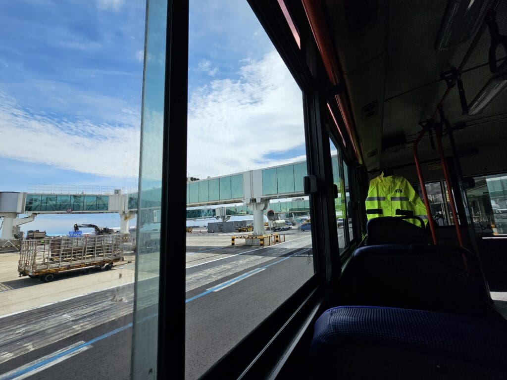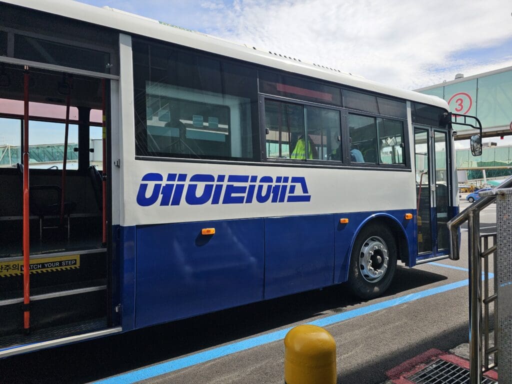 That morning, boarding was scheduled to commence twenty minutes prior to departure at 1000. Considering the fact that passengers had to be shuttled to a remote stand, this didn’t seem like a great amount of time, however, with over an hour between my flight’s scheduled arrival time and my train from Cheongju Airport to Daejeon, I was not particularly concerned about any minor delays. At 0950, two ATS Airport Service agents appeared at the gate and performed an announcement in Korean only advising passengers that boarding was soon to commence. A minute or so later, passengers were permitted to shuffle forward and it wasn’t too long before I reached the gate podium where my boarding pass was scanned and the agent wished me a nice flight. From there, I headed down the stairs and boarded the waiting bus. Compared to Asiana Airport Services and Korean Air buses that I have had the pleasure of riding at Jeju Airport, this was a little more basic and seemed to simply take the form of an old city bus that had found a new life at Jeju Airport. Very surprisingly given the bus’ airside role, the windows of this could be slid open!