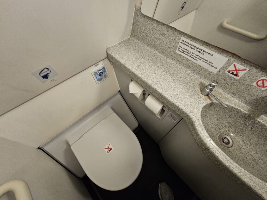 As I made my way down the aircraft, I was left very impressed by the flight attendants, who not only gave me warm and friendly welcomes, and assisted passengers with storing their luggage and finding their seats, but they genuinely seemed very happy to be at work!  Having had plenty of experience flying on Korean carriers, whilst service levels are usually high, sometimes the crew can seem to be a little robotic. However, I was delighted to find that this wasn’t the case on Aero K. After receiving two more lively welcomes as I wandered down the cabin, I reached 23F, and, seeing as I may end up trapped for the duration of my flight, once I had stowed my bag, I decided to pay a visit to one of the two lavatories at the rear of the jet. Upon opening this up, I found the lavatory to be clean, tidy and in a reasonable state with only a few signs of wear and tear. Hinting at the aircraft’s past life, I spotted a single bilingual Spanish-English sign.